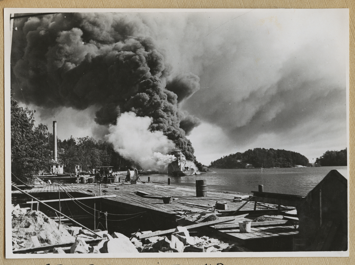 Bilden visar en brinnande jagare under Hårsfjärdskatastrofen.