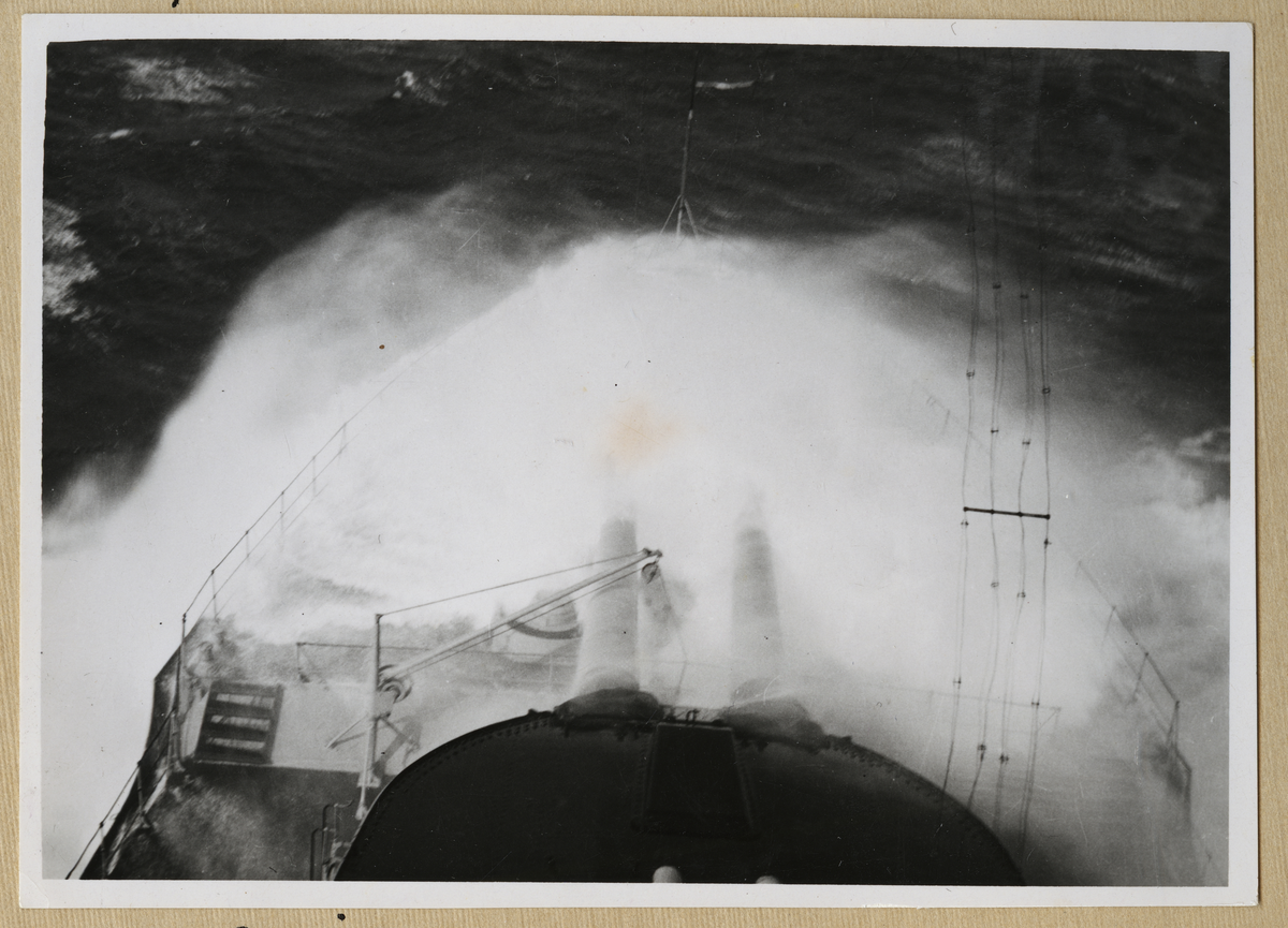 Bilden visar förskeppet av pansarskepp Sverige i en stormig sjö.
