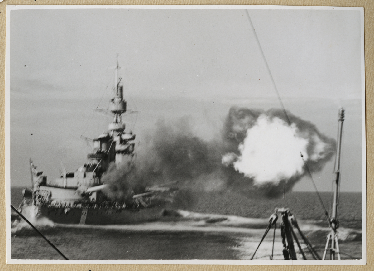 Bilden visar pansarskeppet Sverige med neutralitetstecken som avfyrar sina kanoner.