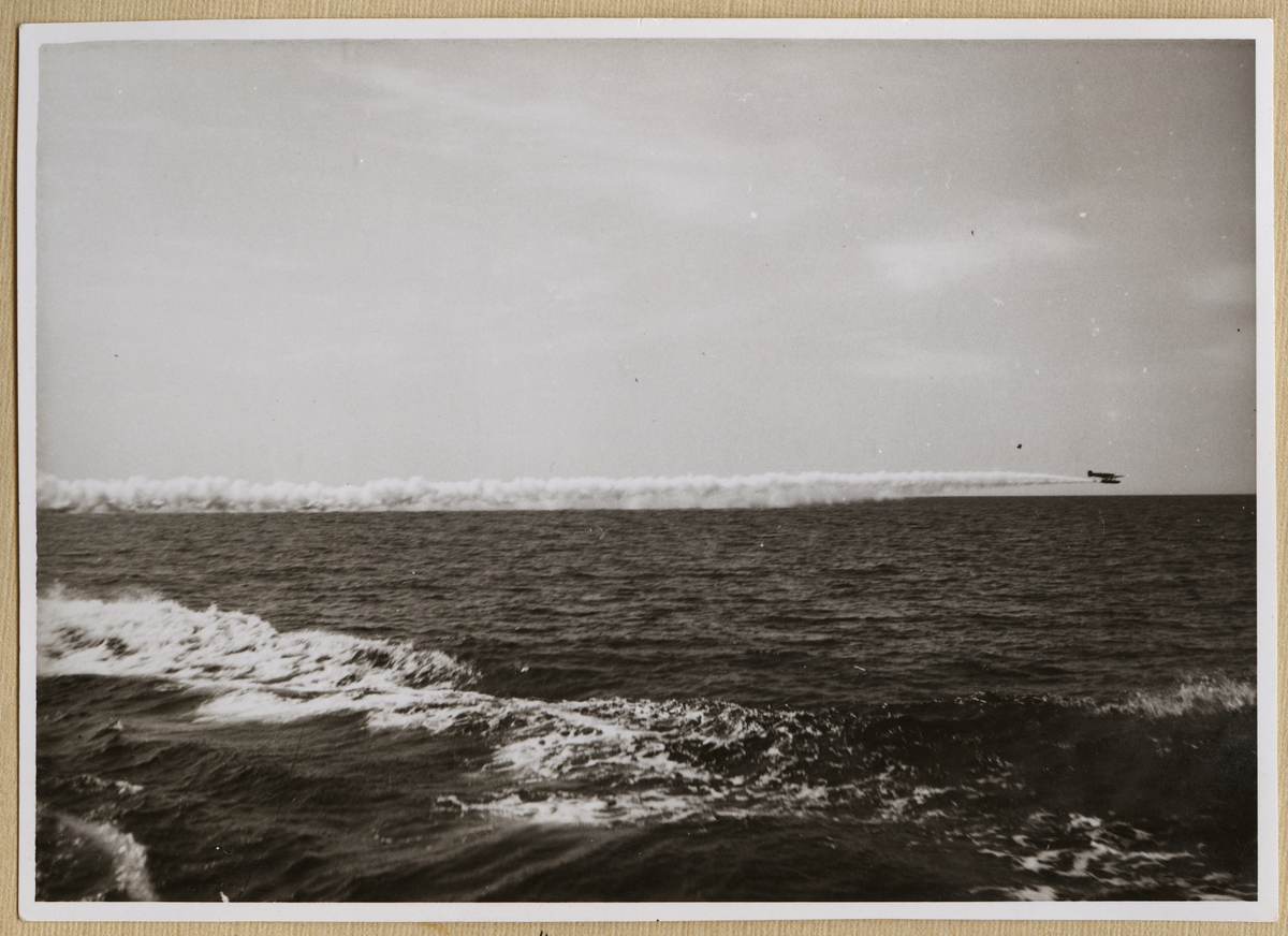Bilden visar ett sjöflygplan som lägger ut en dimridå över havet.