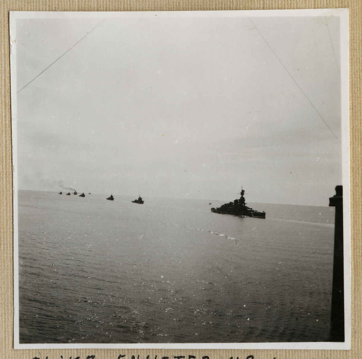 Bilden visar ett pansarskepp och andra örlogsfartyg till havs
