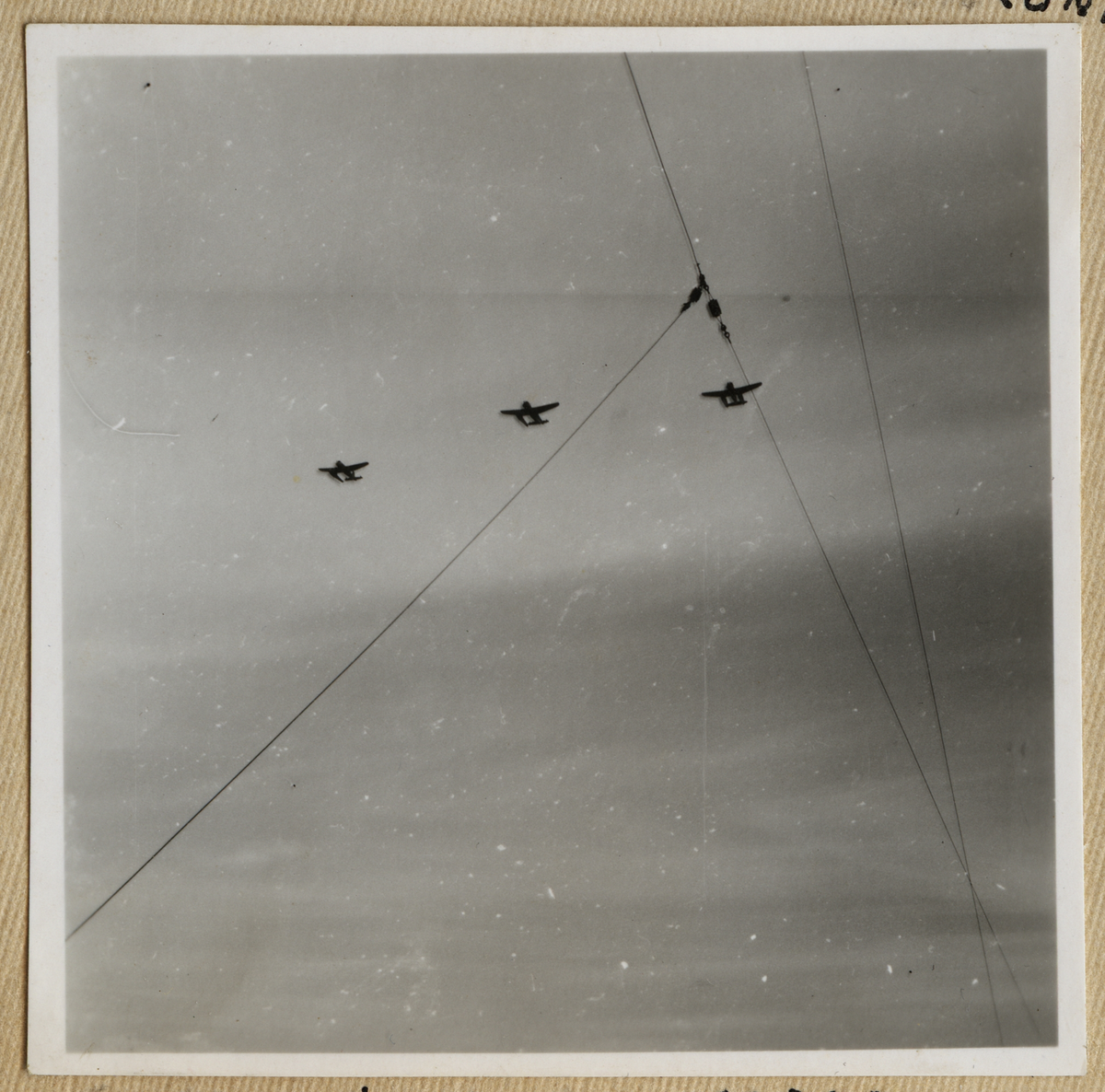 Bilden visar tre sjöflygplan som passerar över pansarskepp Sverige.