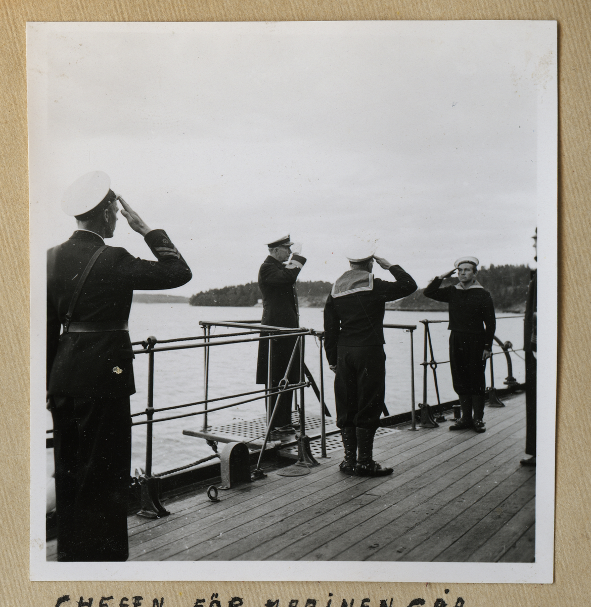 Bilden visar chefen för marinen Helge Strömbäck som kliver ombord på pansarskepp Sverige.