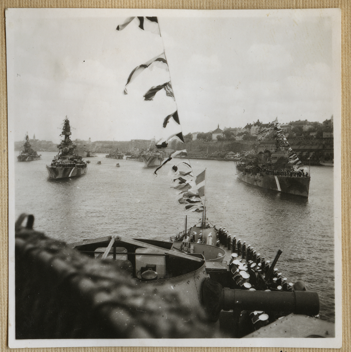 Bilden visar en del av den Svenska flottan till ankars på Stockholms ström.
