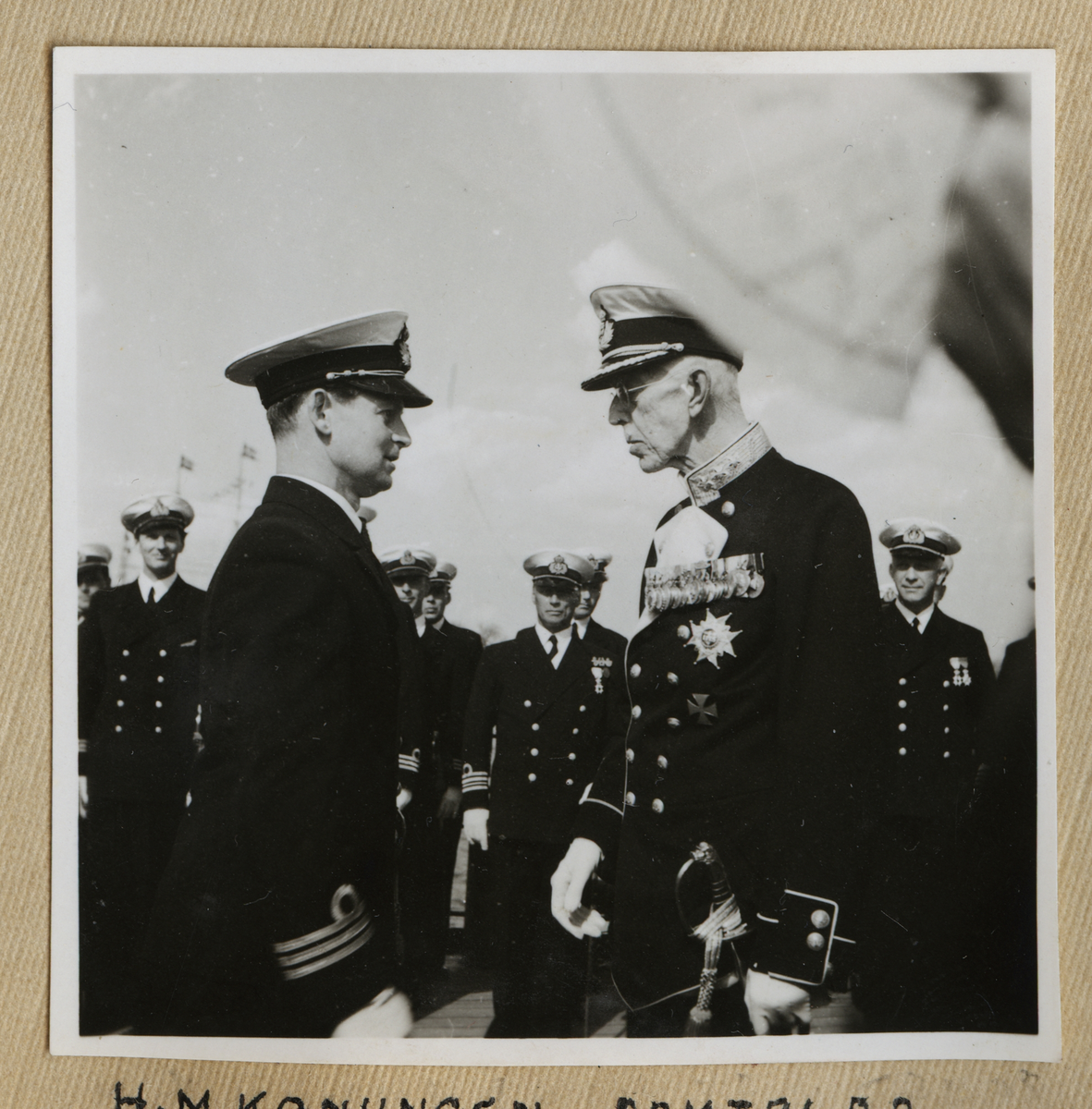 Bilden visar kung Gustav V i samtal med en sjöofficerare ombord på pansarskepp Sverige.