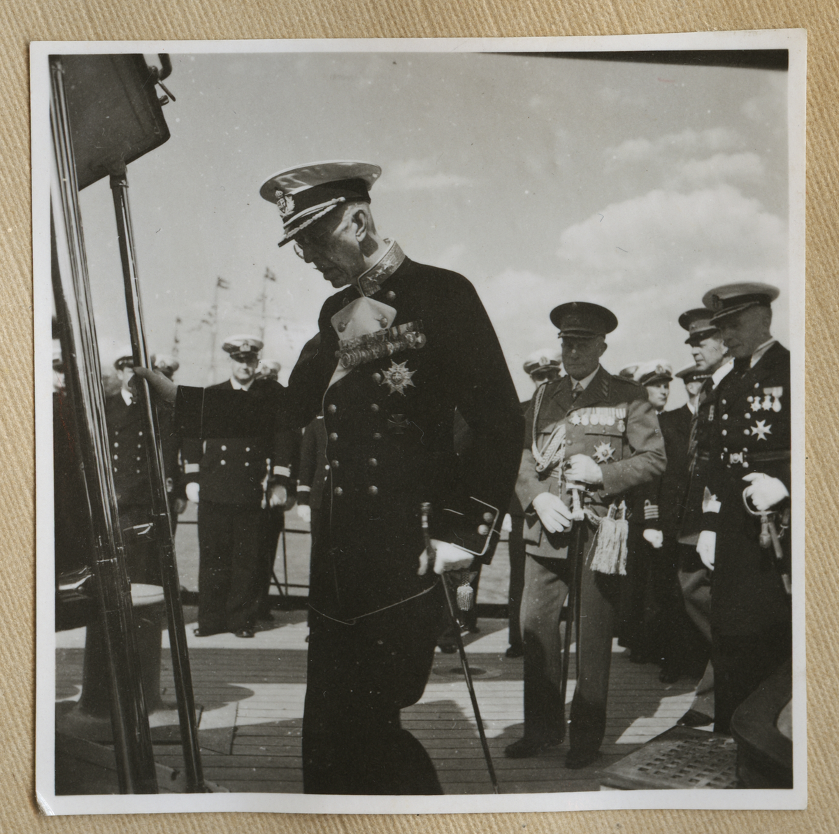 Bilden visar kung Gustav V ombord på pansarskepp Sverige.