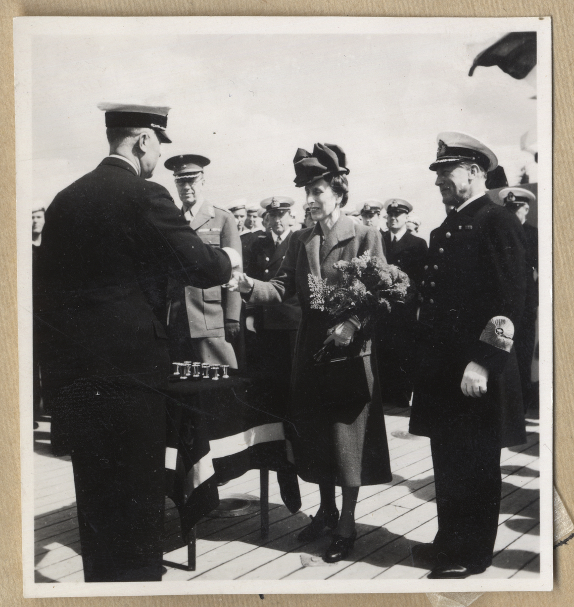 Bilden visar kronprinsparet som samtalar med högs sjöofficerare ombord på pansarskepp Sverige.
