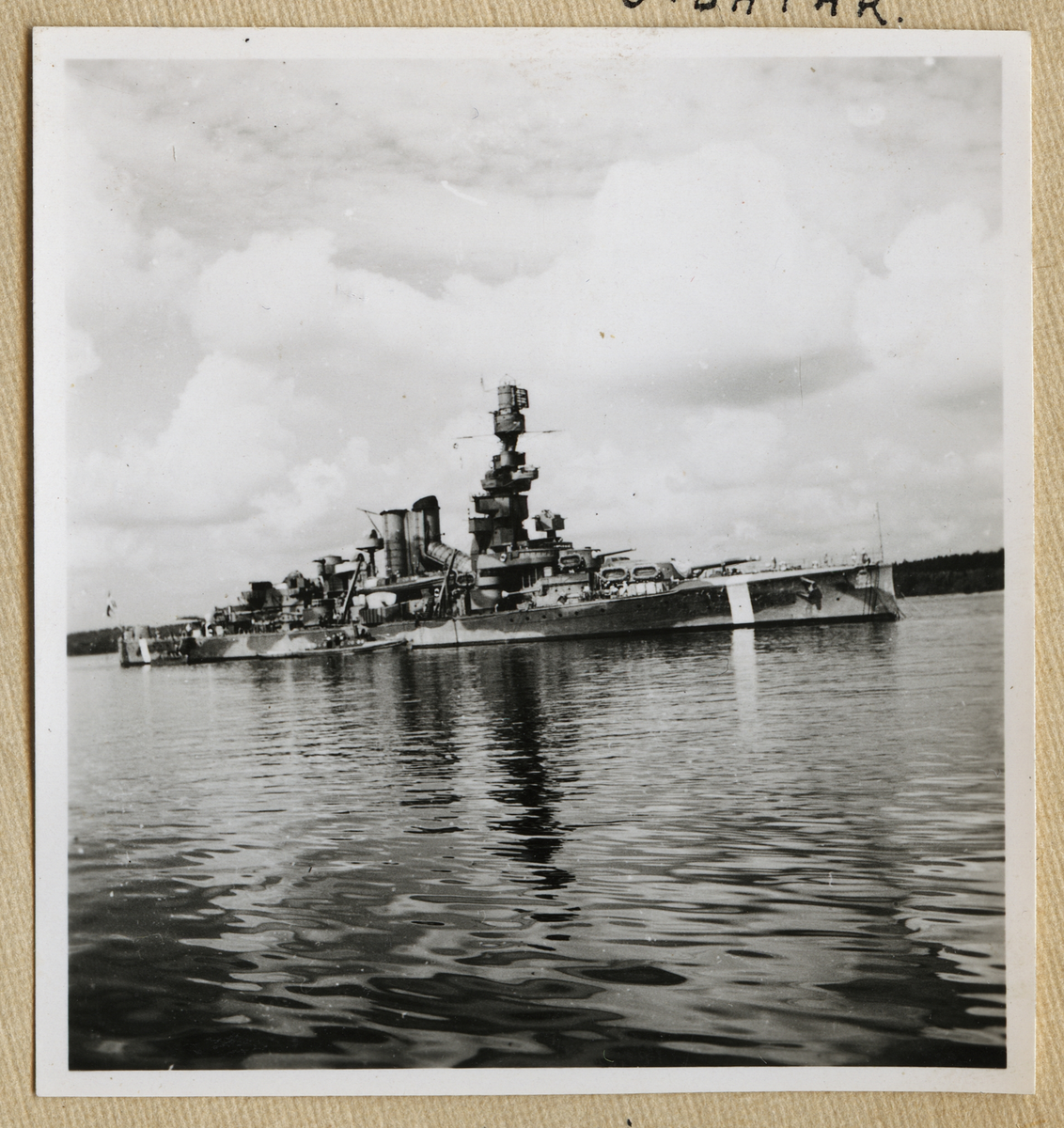 Bilden visar pansarskepp Sverige med maskeringsmålning och neutralitetstecken.