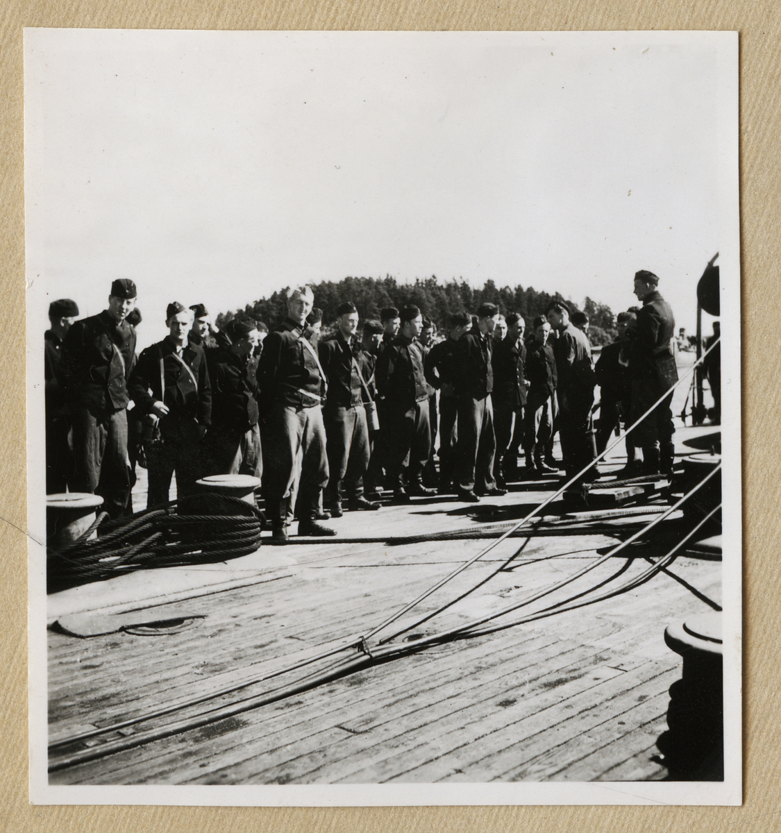 Manskapet av ett örlogsfartyg har samlats på däcket och blir tilltalat av ett befäl.