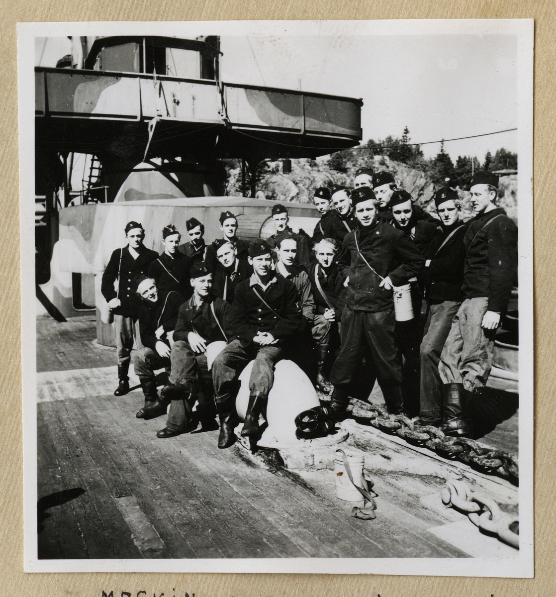 Bilden visar manskapet av ett örlogsfartyg.