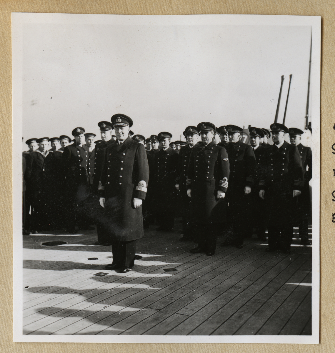 Bilden visar chefen för kustflottan som ett antal högre sjöofficerare som har tagit uppställning på pansarskepp Sverige.