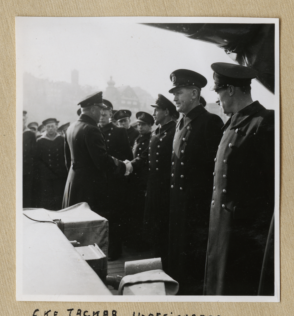 Bilden visar chefen för kustflottan som skakar hand med underofficerare ombord på pansarskepp Sverige.