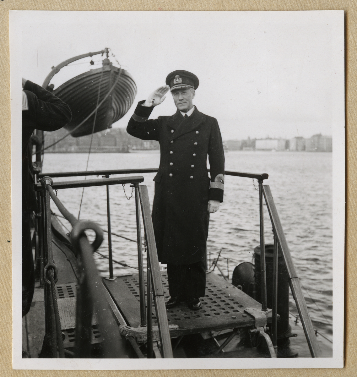 Bilden visar Yngve Ekstrand som lämnar pansarskepp Sverige.
