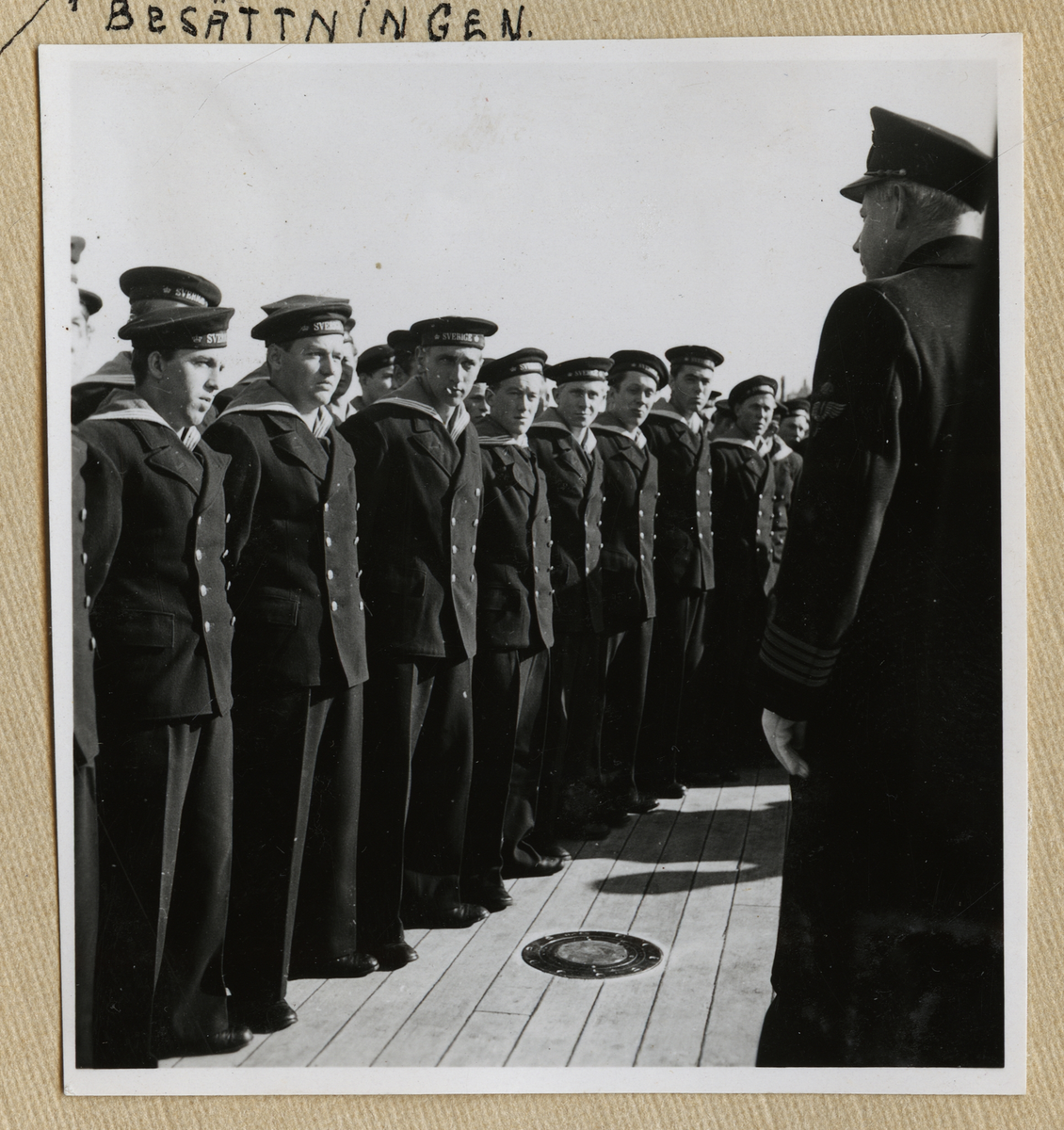 Bilden visar kommendör Hammargren talar till besättningen av pansarskepp Sverige.