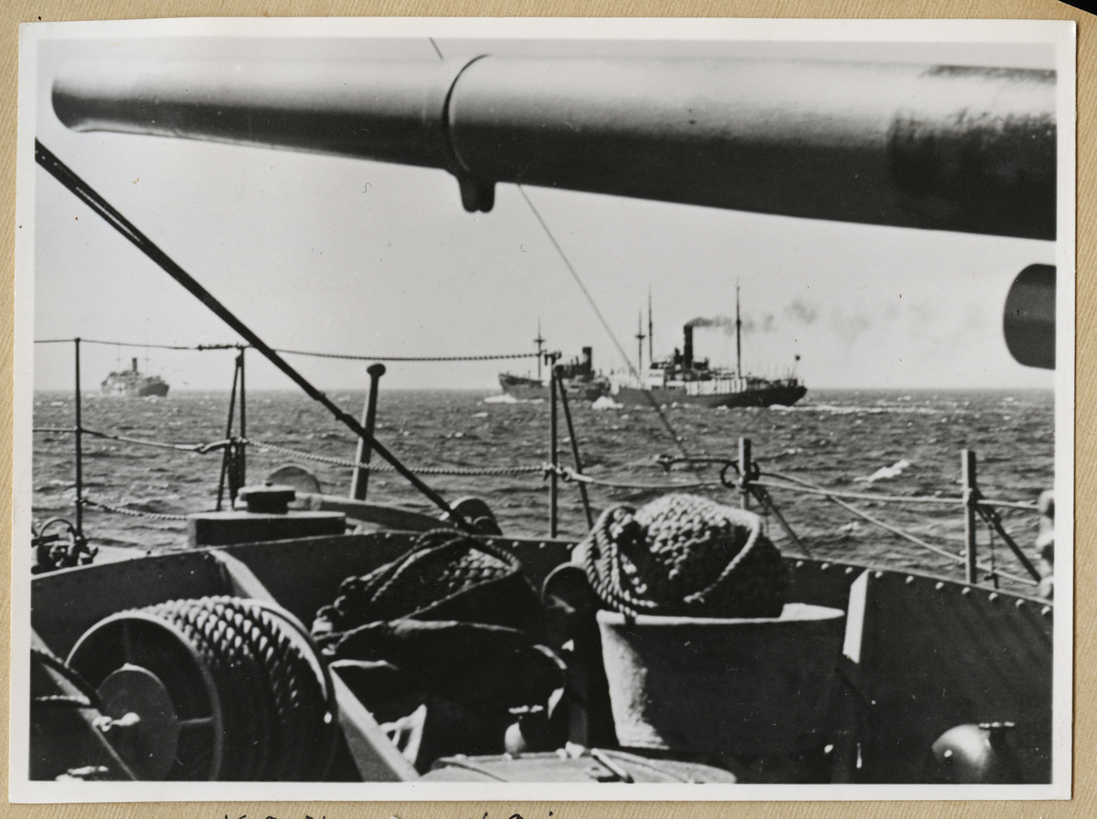 Bilden visar en konvoj med handelsfartyg sedd från pansarskepp Sverige.