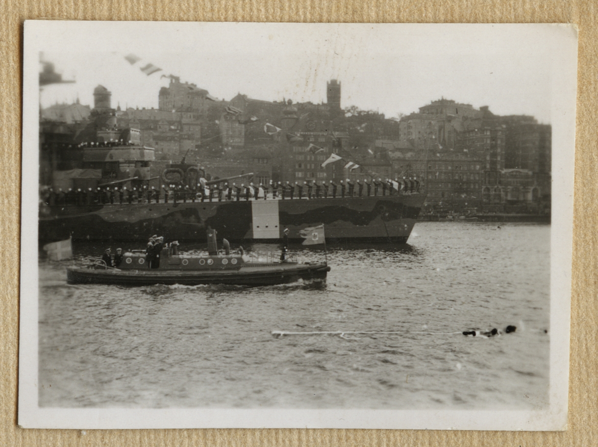 Titel: Manskapet och befäl på ett örlogsfartyg har tagit uppställning på däck för att hälsa konungen som passaerar fartyget på en ångbarkass.