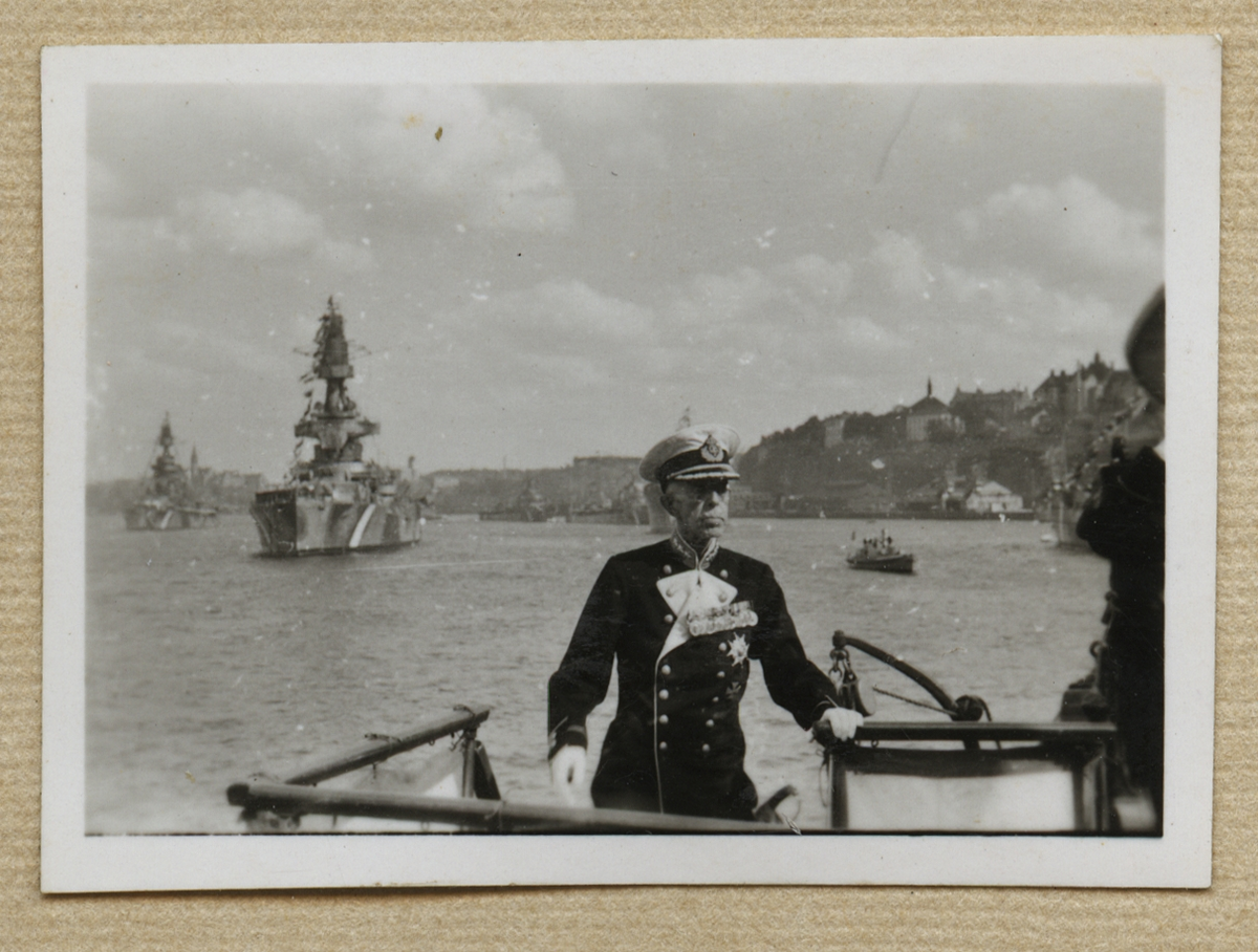 Kung Gustav V kliver ombord på pansarskepp Sverige. I bakgrunden syns svensk örlogsfartyg med neutralitetstecken.