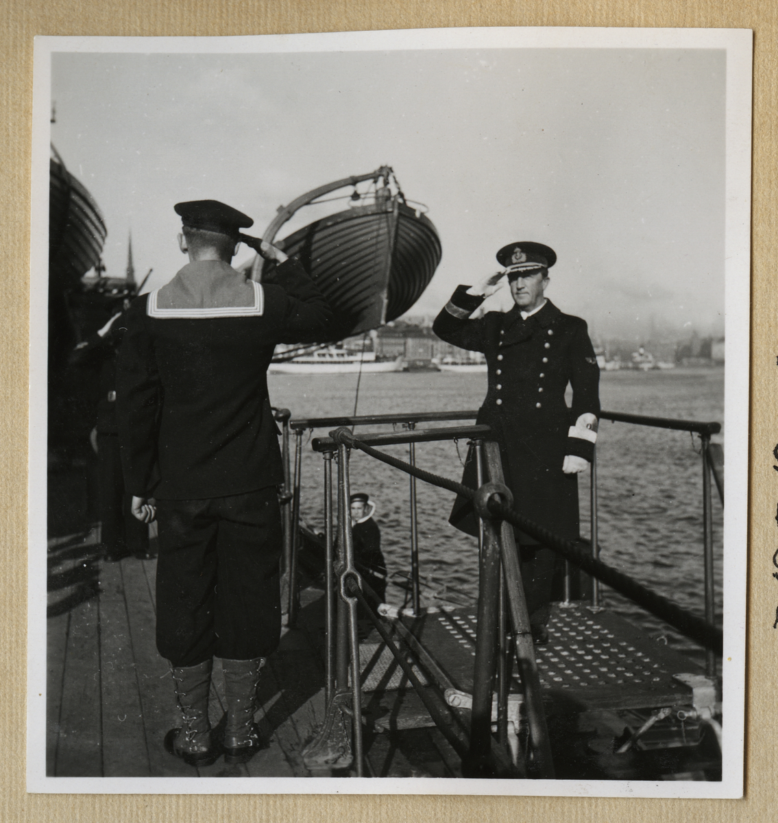 Bilden visar amiral Samuelson som hälsar en sjöman medan han kliver ombord på pansarskepp Sverige.