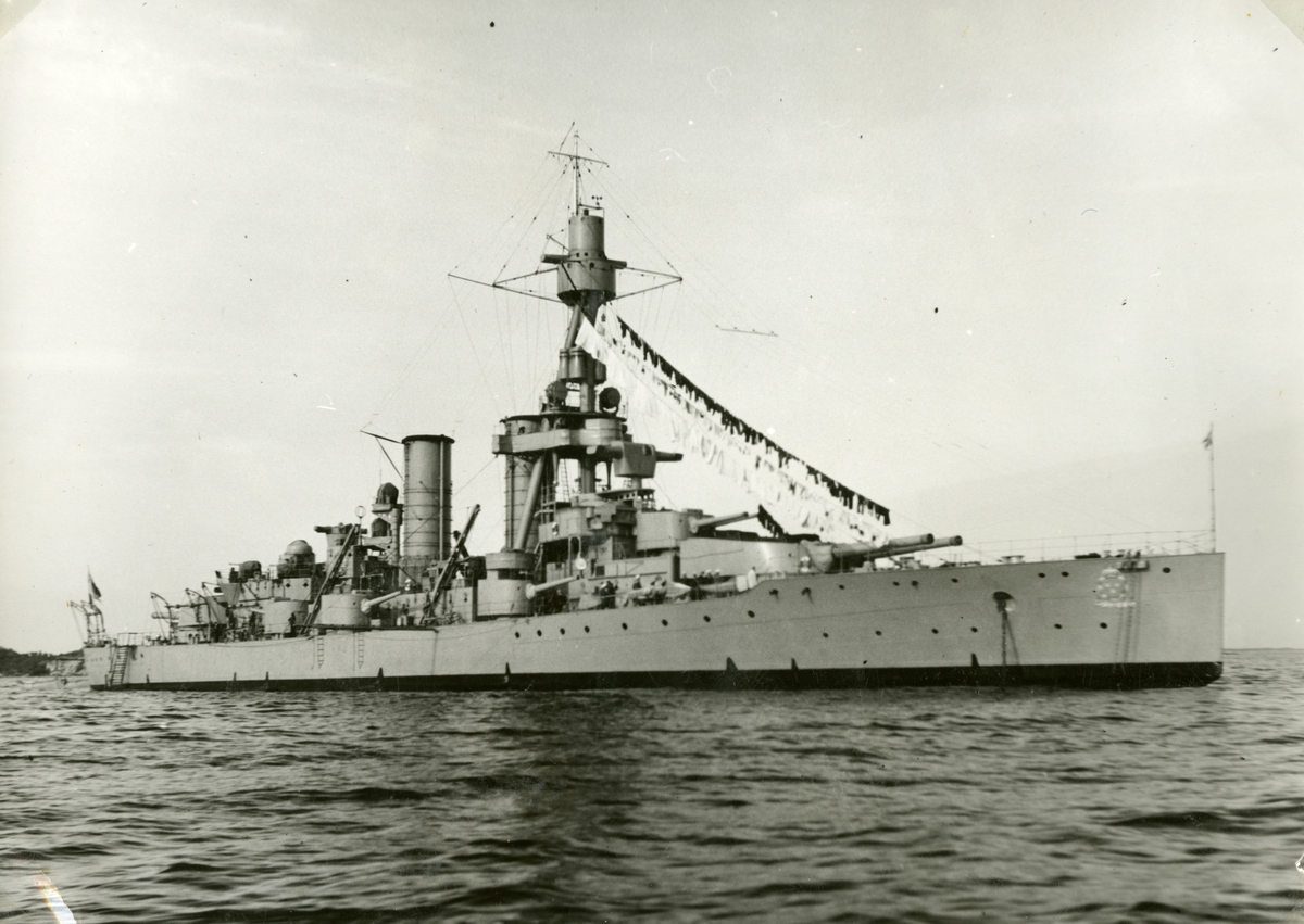 Bilden visar pansarskepp Drottning Victoria som har förvandlats i en jätte torkställ för manskapet kläder, som hänger på tork upp till mastspetsen.