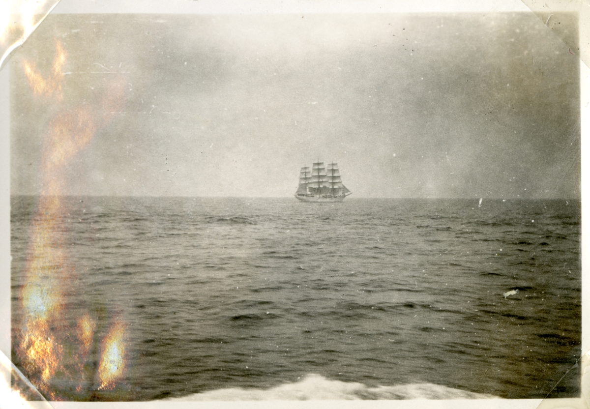 Bilden visar skeppsgossefartyget Jarramas med satta segel till sjöss från syrbordssida.