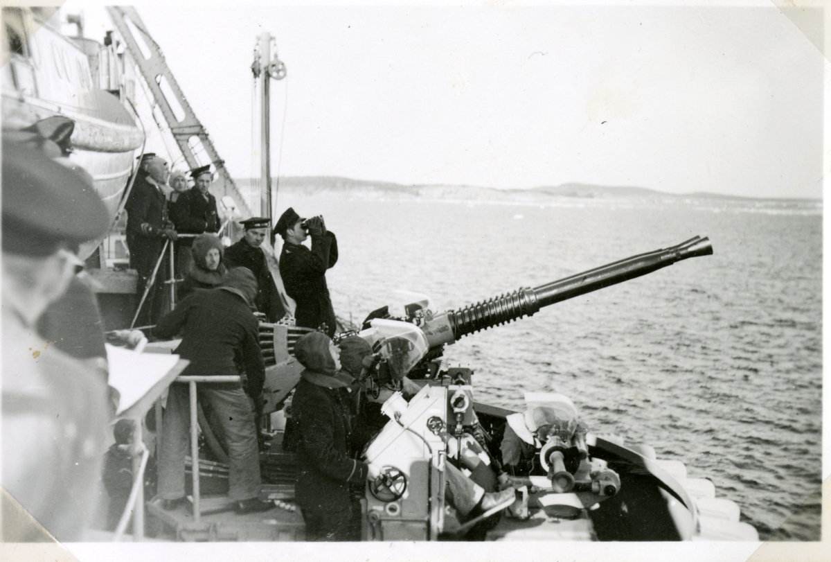 Bilden visar en grupp militärer som står runt ett luftvärnskanon och kikar på himmelen.