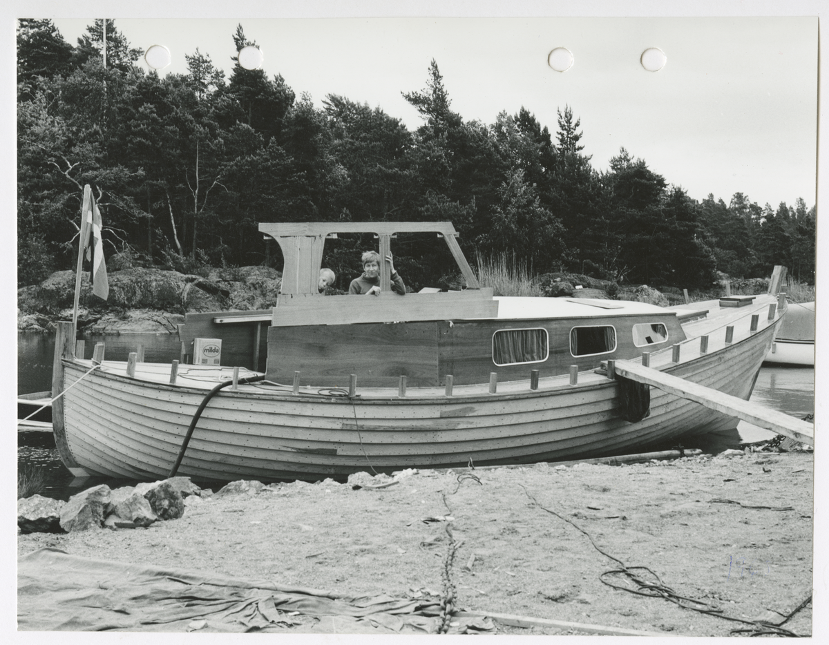 Fritidsbåten RENATA vid kajen efter sjösättning. Marion Vizins och hennes son sitter ombord.