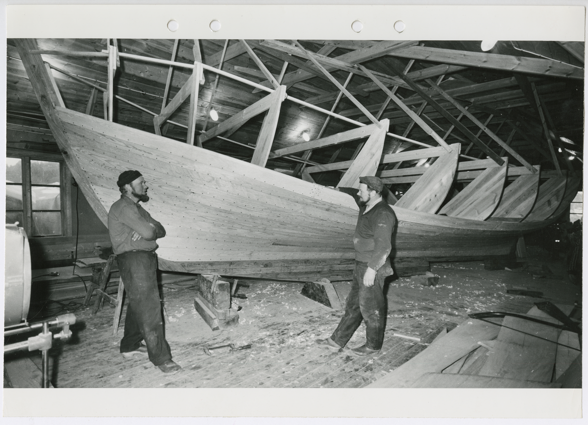 Titel: Två män vid bygget av fritidsbåten RENATA.