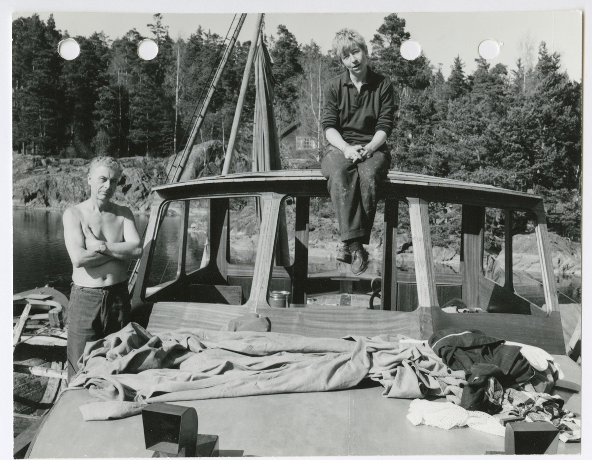 Fritidsbåten RENATA vid sjösättning. Marion Vizins sitter ombord.