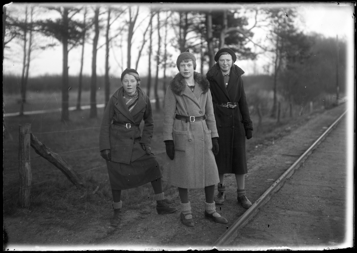 Tre unga kvinnor vid järnvägsspår