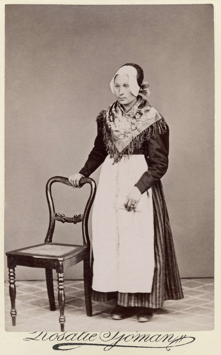 Titel: Kvinna står och håller i stolsryggen