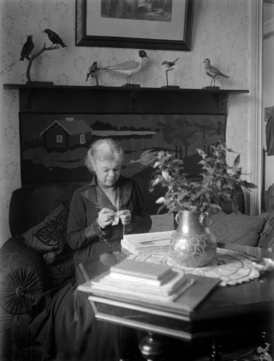 Rofyllt porträtt av Hilma Sofia Lindvall i handarbete i skenet av fönstret ljusflöde. Bakom kameran stod sannolikt maken Per Ivar som önskade fånga hustrun i ett alldagligt men minnesvärt ögonblick. Foto 1919.