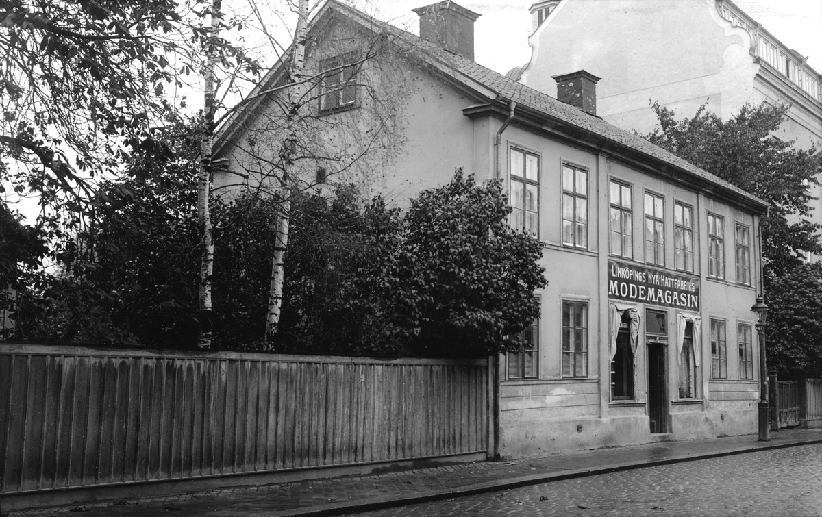Nedslag i Linköping 1927 där S:t Lars församlings gamla komministerboställe ännu var i bruk. Året därpå skulle staden köpa tomten och efterhand kom huset att stå i vägen för Postverkets expansion. Modemagasinets verksamhet i byggnaden har inte följts för denna presentation.