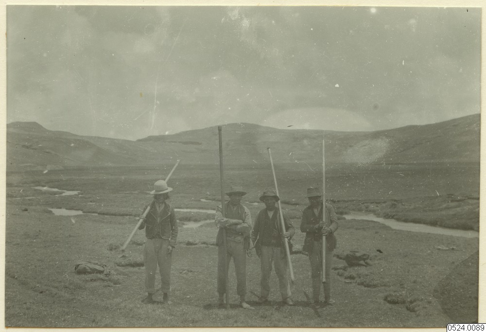 Pampa Tholoro. Fyra män med långa stavar/käppar.