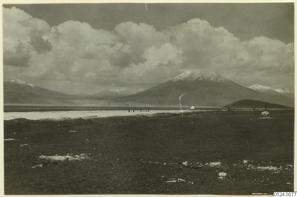 Salpeterfält (torkning) i Antofagasta-distriktet. Fotografiet, som är taget nära den chilenskt-bolivianska gränsen visar en hel rad av utslocknade vulkaner, vilkas snöhöljda "käglor" i hög grad har den stympade konens form.