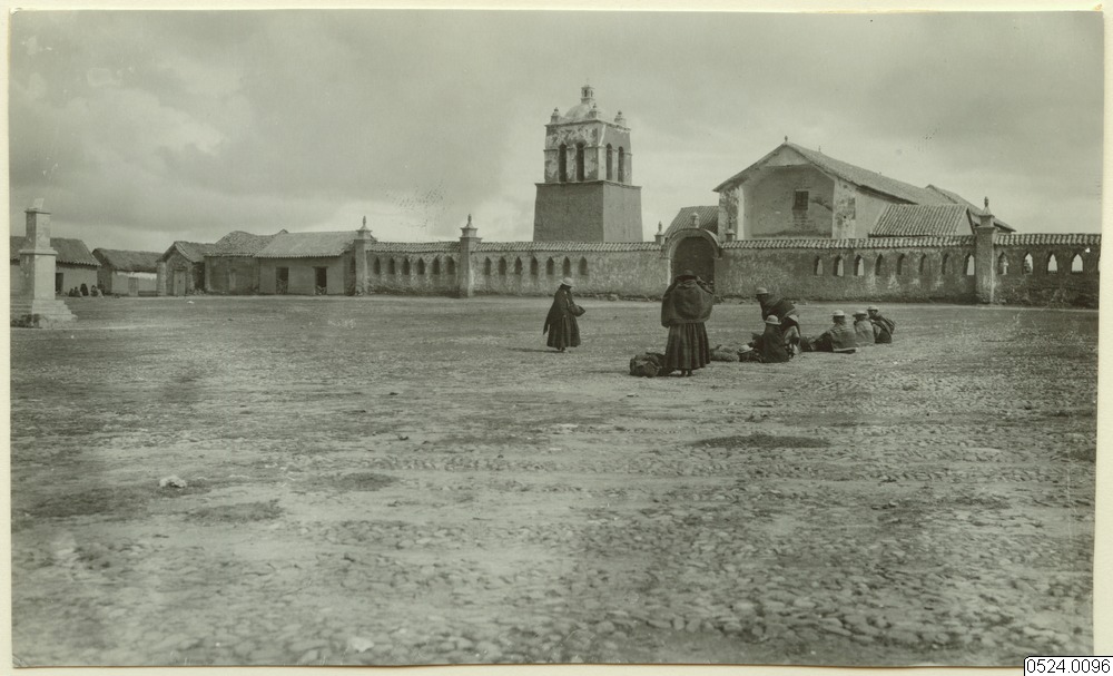 Torghandel på plazan i Calacoto. Som synes äro "affärerna" talrikare än kunderna. I bakgrunden ligger byns kyrka, typisk för den bolivianska högslättten.