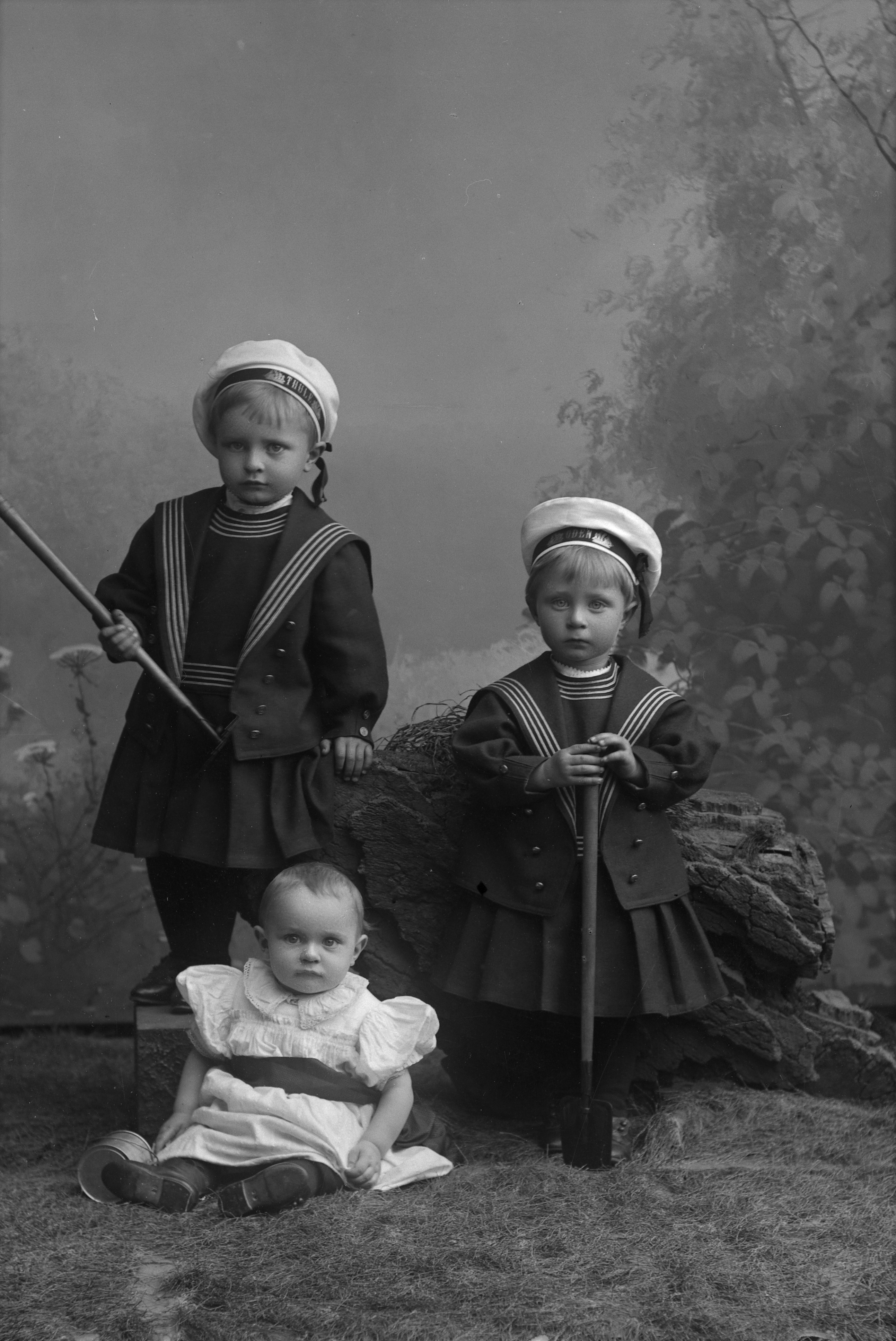 Porträtt i helfigur av fru Lindblads barn, de två äldsta iklädda sjömanskostym och -mössor, hållande varsin långskaftad hacka. Det yngsta barnet sittande på marken. Ateljéfond med skogs- och blomstermotiv utgör bakgrunden.