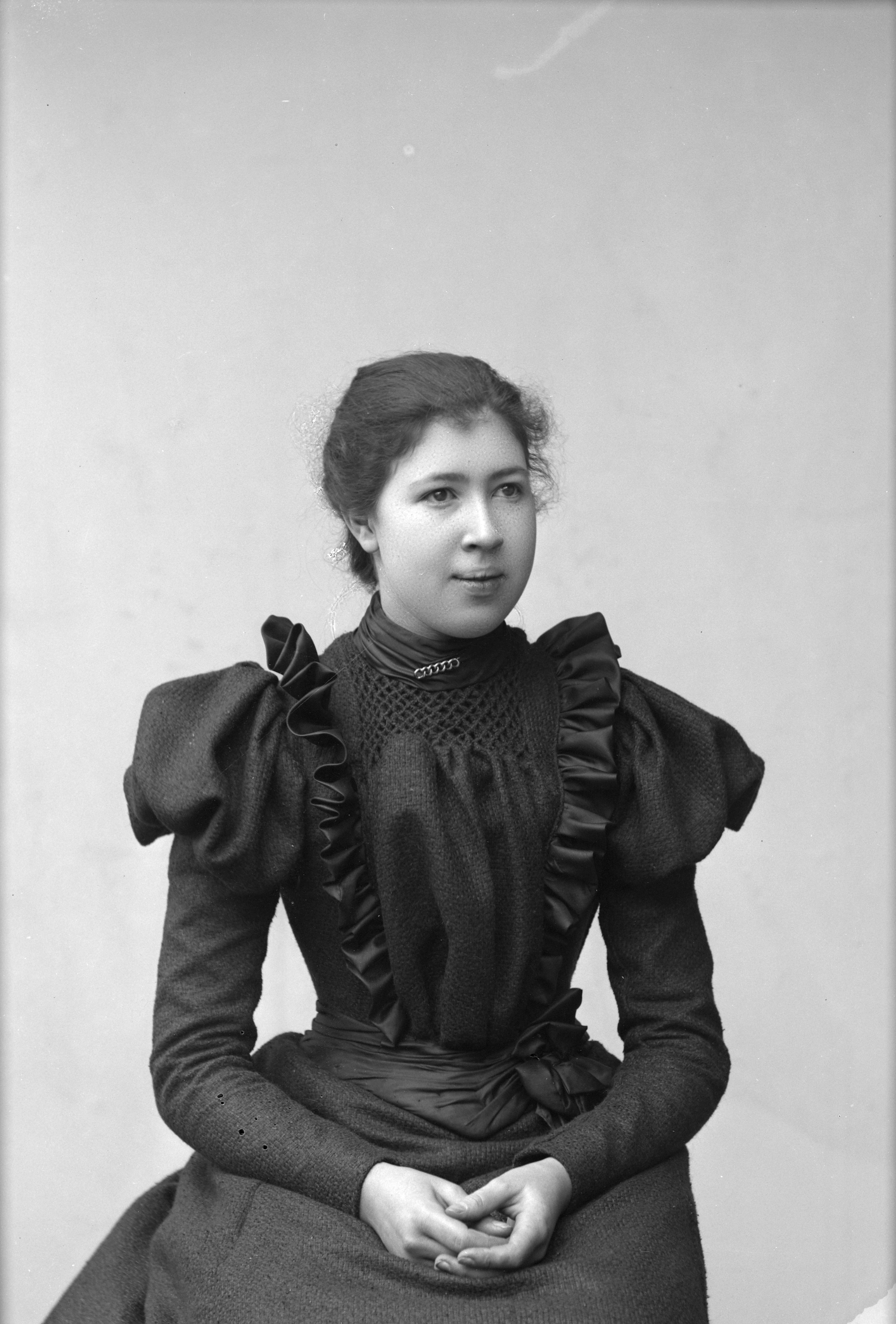Beskrivning: Porträtt i halvfigur av Anna Jönsson vid Baudes Café.