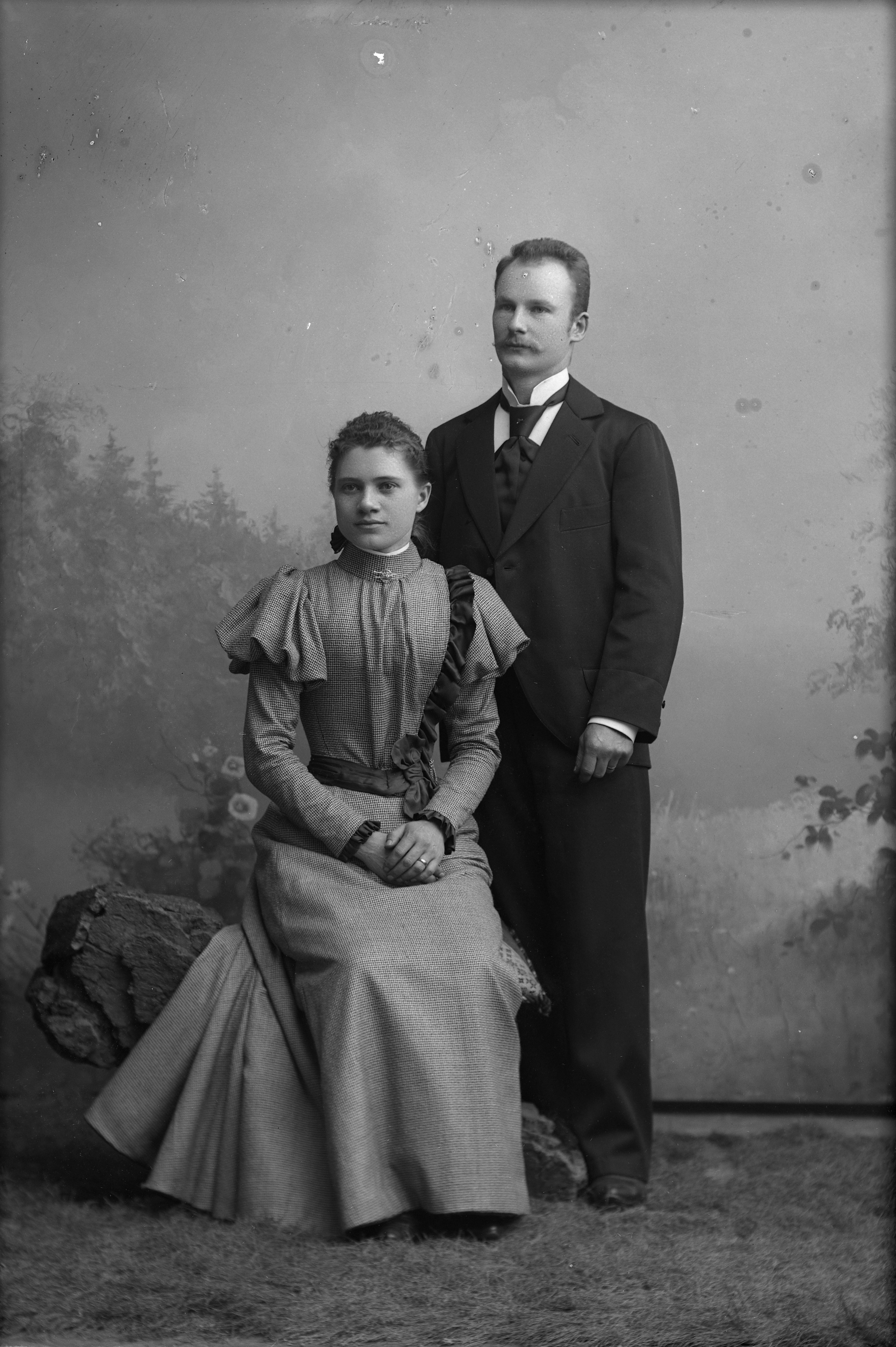Porträtt i helfigur av J. Andersson med fru. Frun sittande på stenhäll. Fotograferade framför ateljéfond med skogsmotiv.