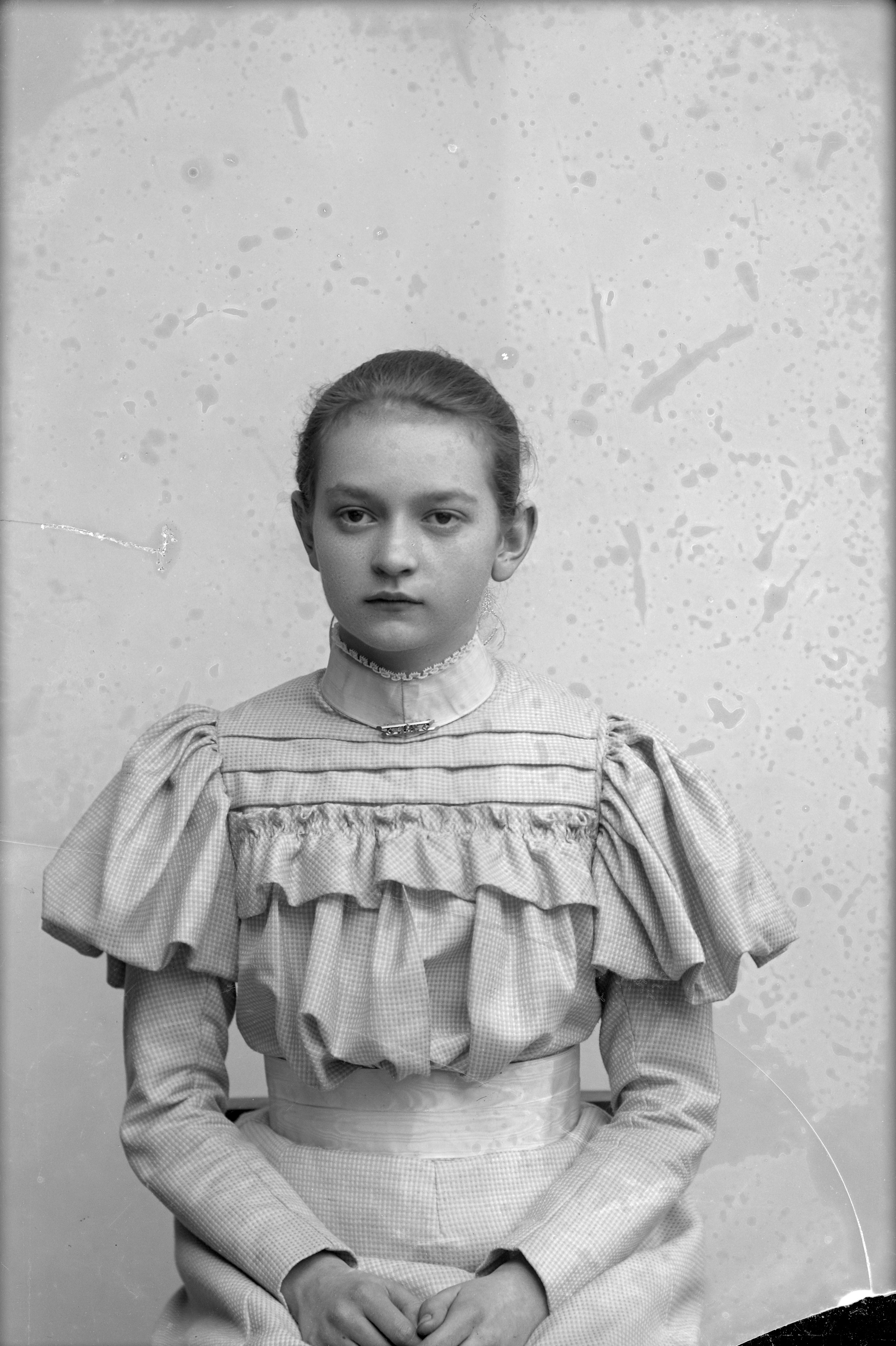 Porträtt i halvfigur av Hildur Johnsson, butiksbiträde i smöraffär.