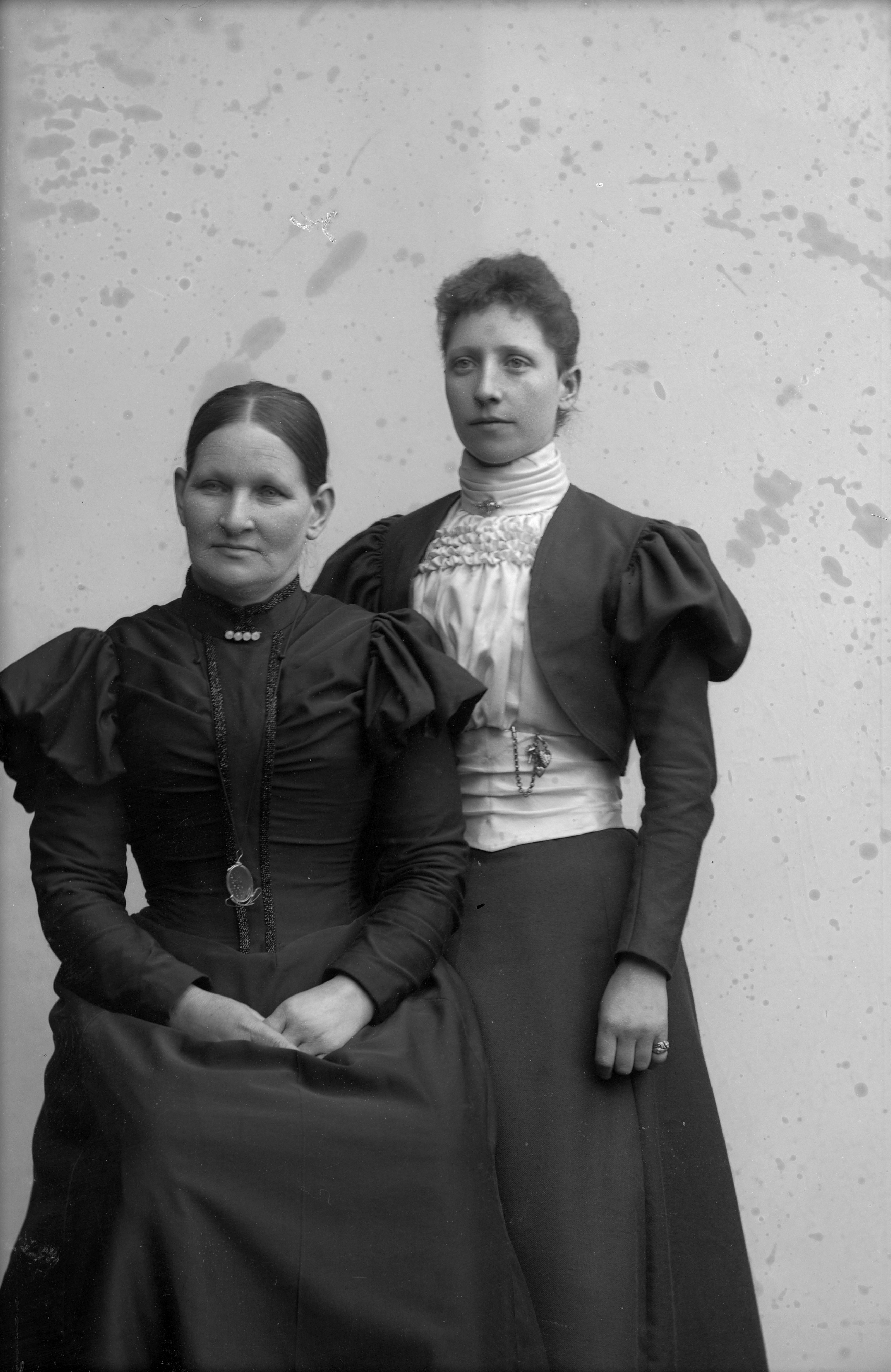 Beskrivning: Porträtt i helfigur av Hulda Jonsson med okänd kvinna.