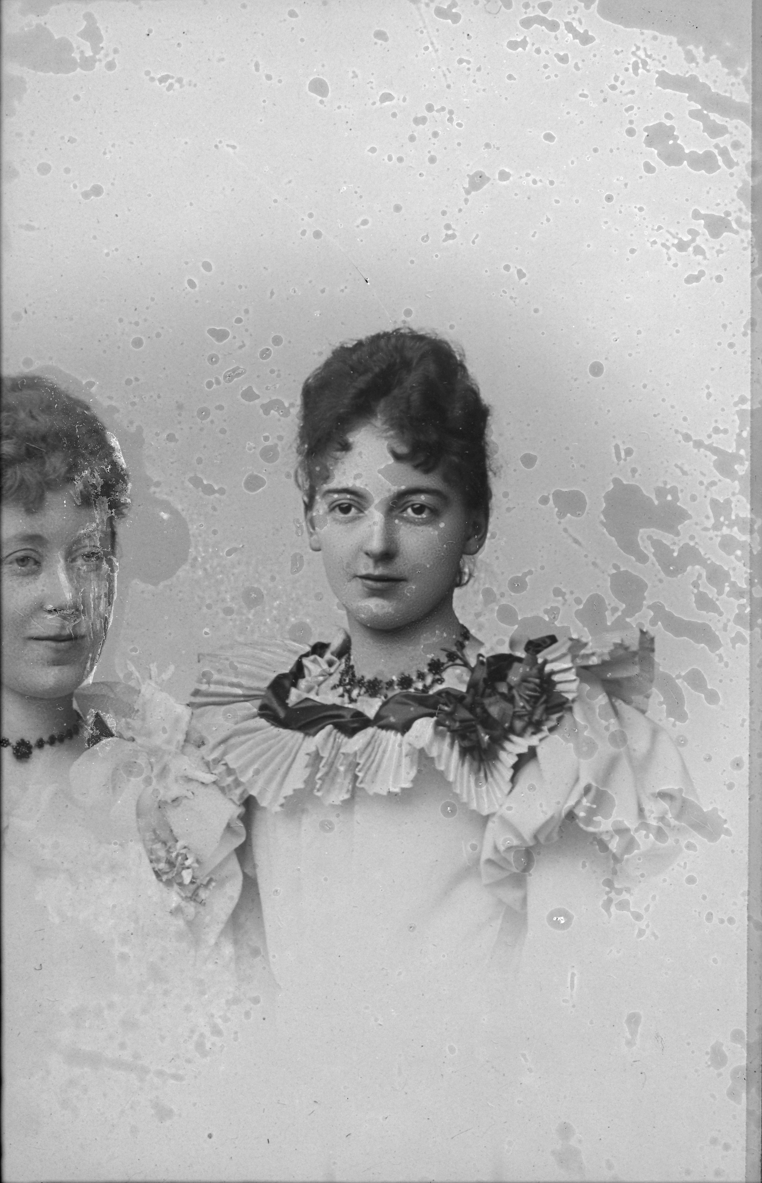 Porträtt i halvfigur av Hedvig Nilsson och Sigrid Dahlgren, delvis synlig. Del av ursprungligt parporträtt.