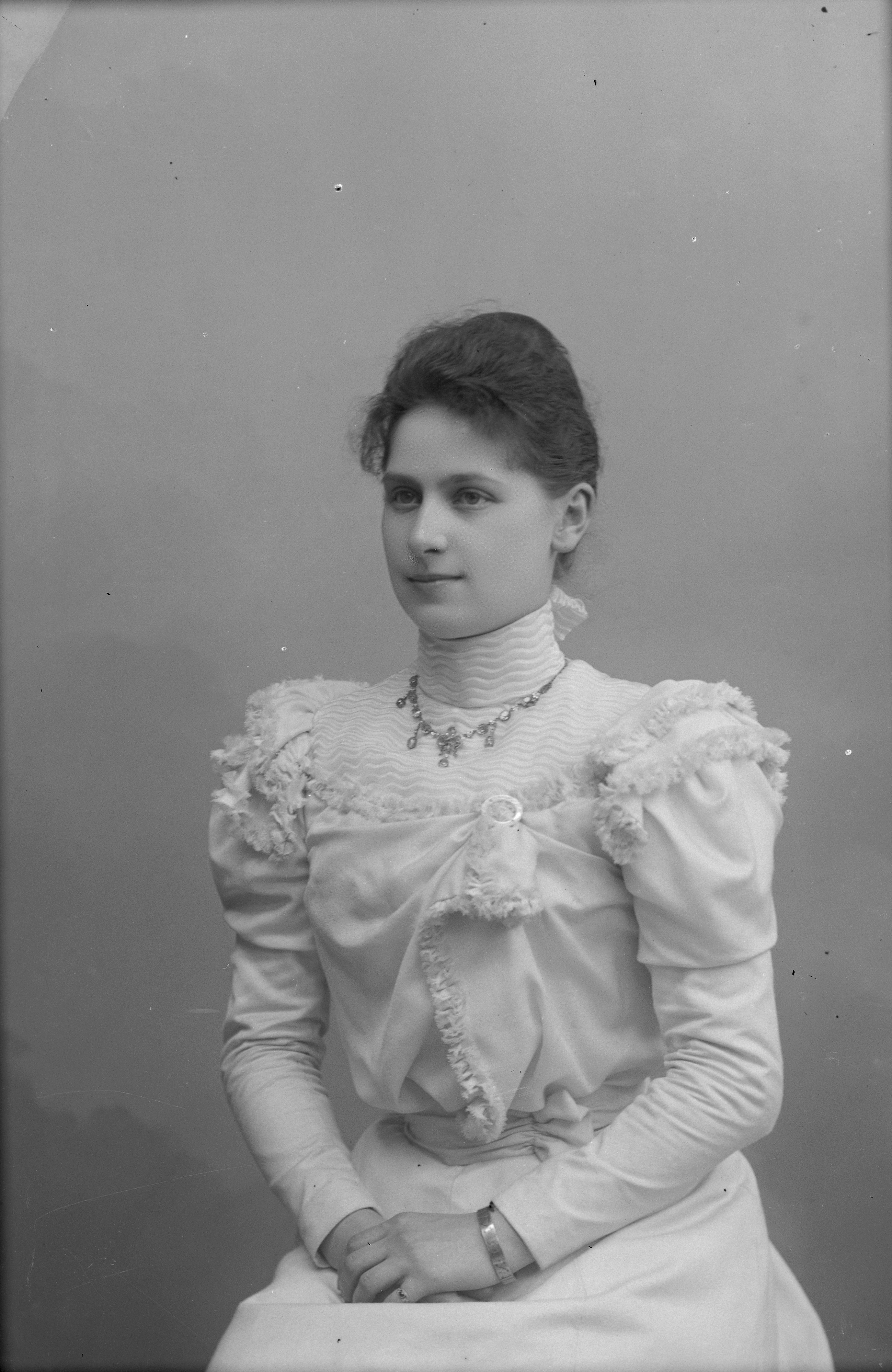 Beskrivning: Porträtt i halvfigur av frisörskan Anna Nathan.