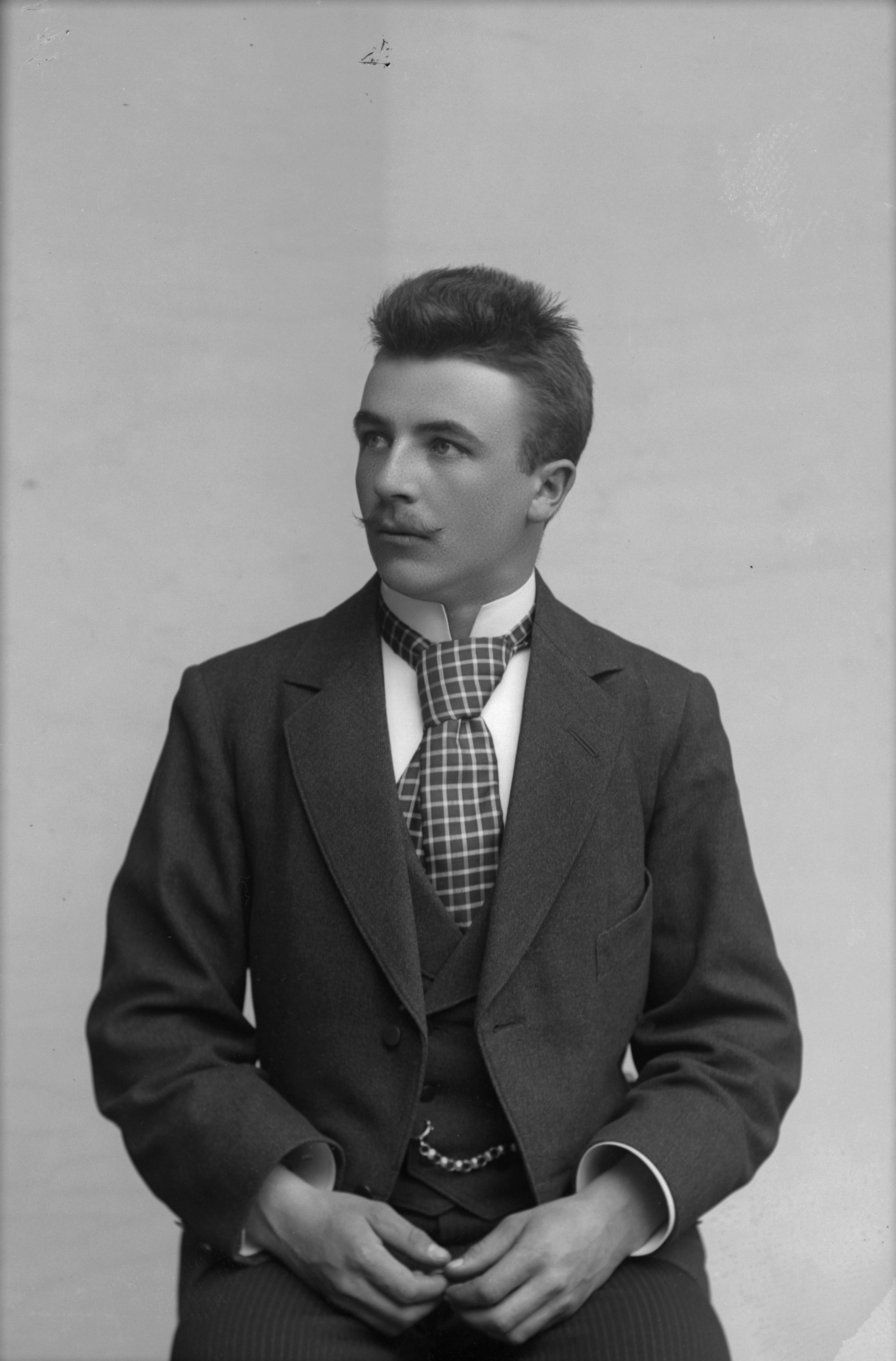 Beskrivning: Porträtt i halvfigur av folkskollärare Lars Angberg i Alöv.