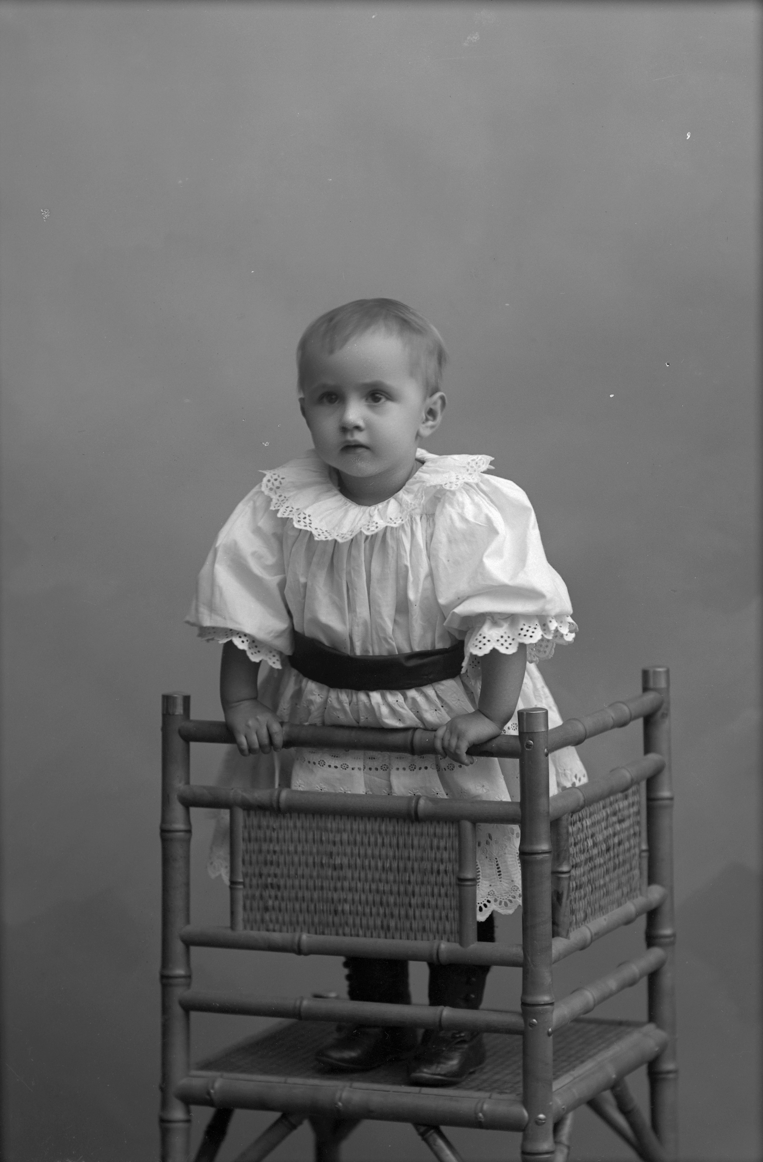 Porträtt i helfigur av fru Sylvans dotter, stående på stol.