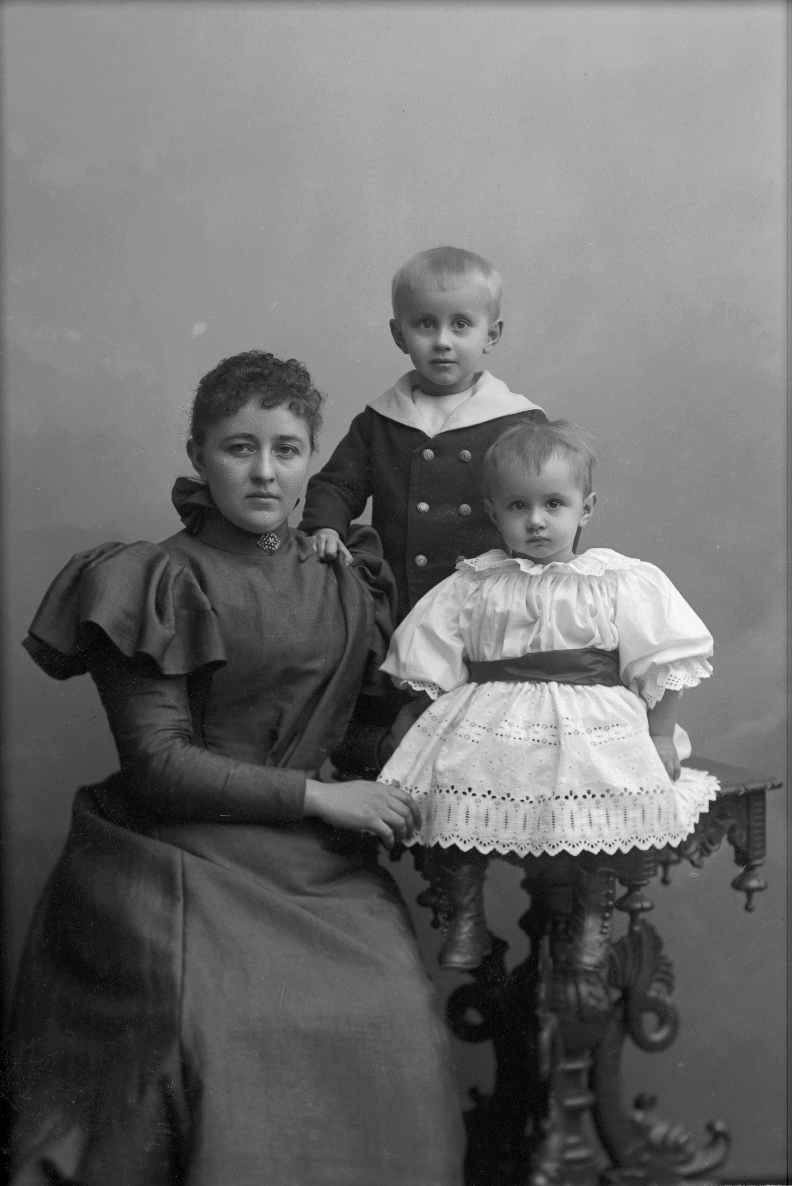 Porträtt i helfigur av fru Sylvan med son och dotter. Dottern sittande på pelarbord, sonen iklädd sjömanskostym.