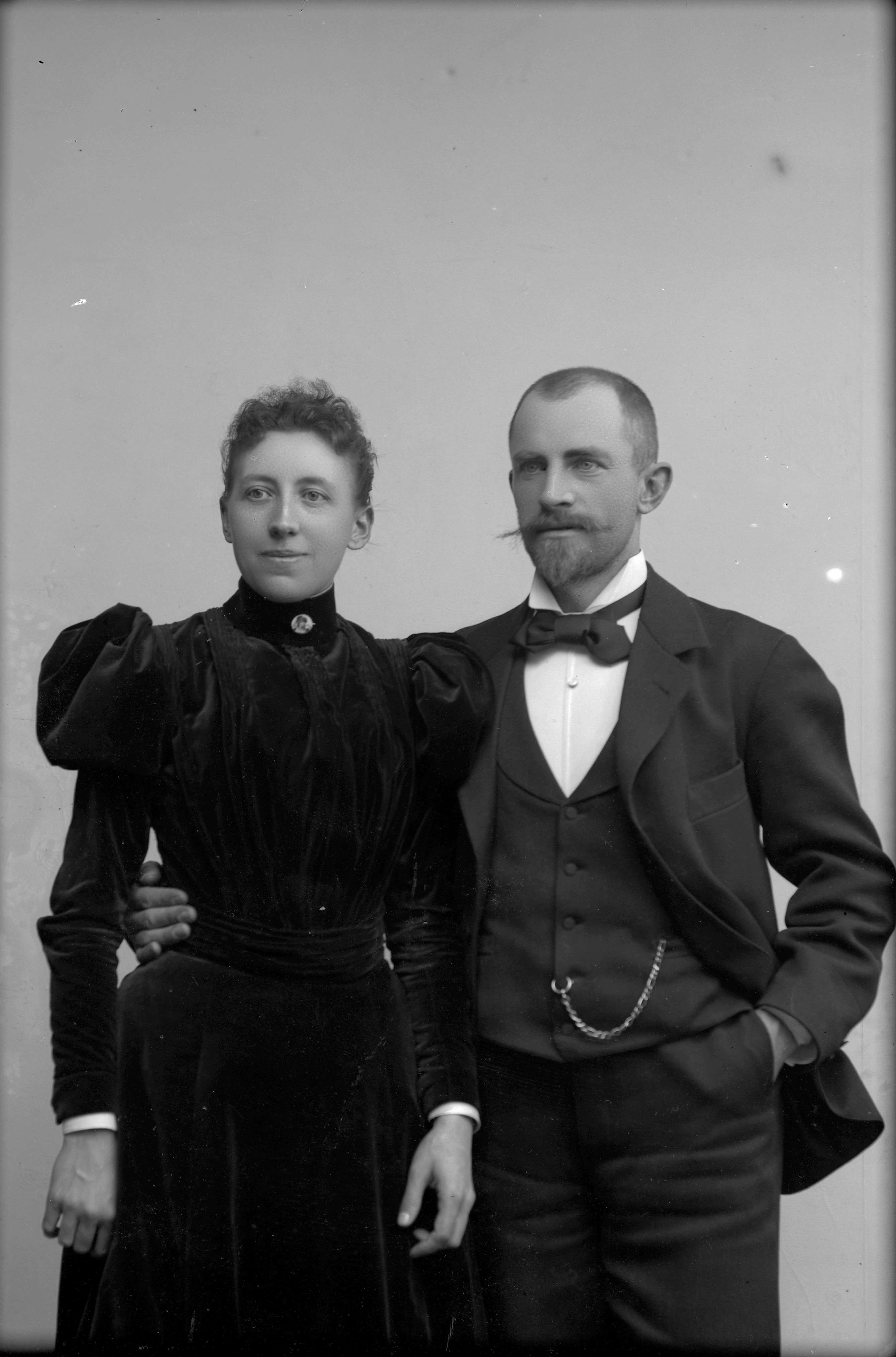 Beskrivning: Porträtt i helfigur av herr Vahlgren med fru.