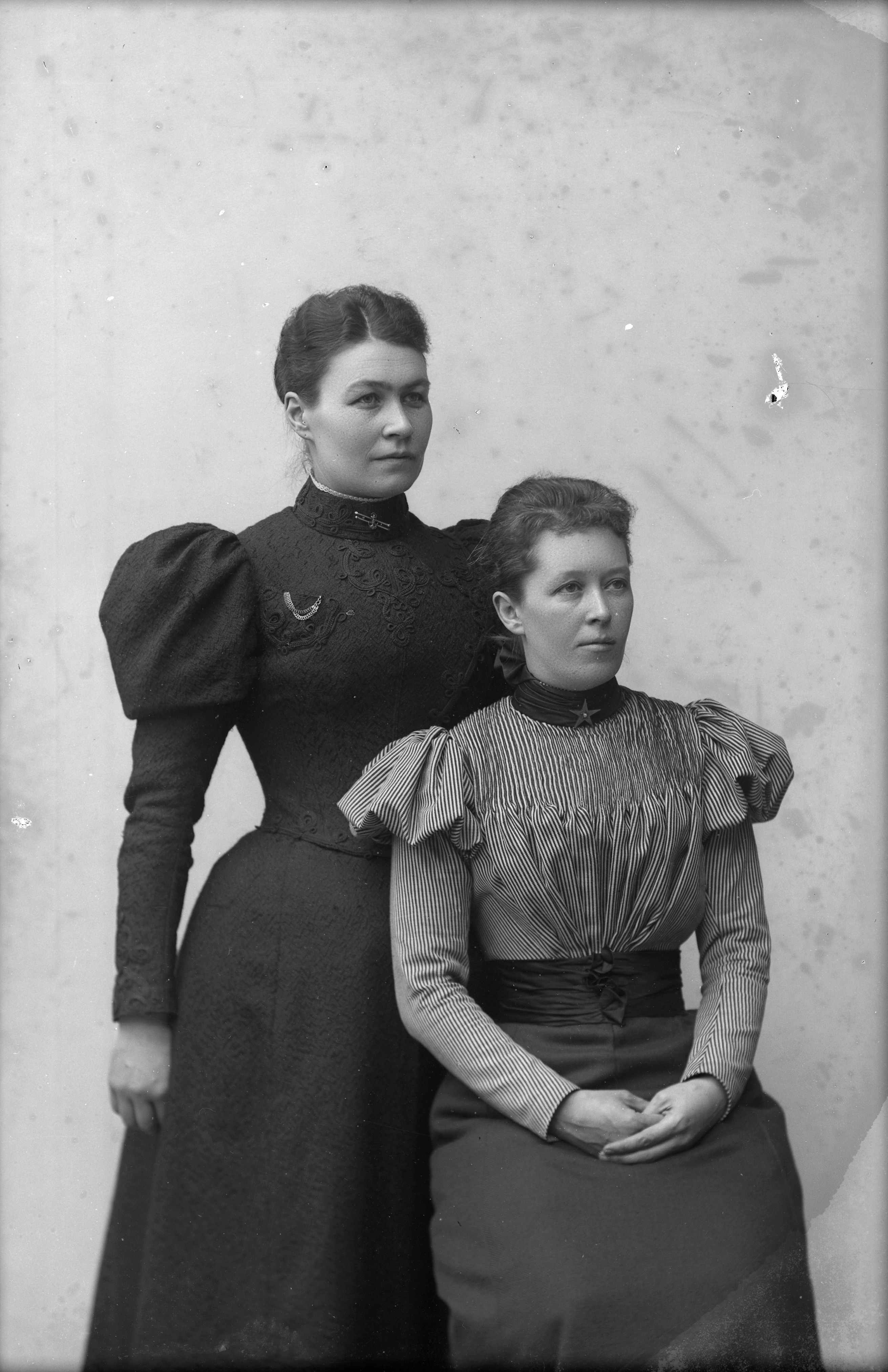 Beskrivning: Porträtt i helfigur av Emma Lundgren med okänd kvinna.