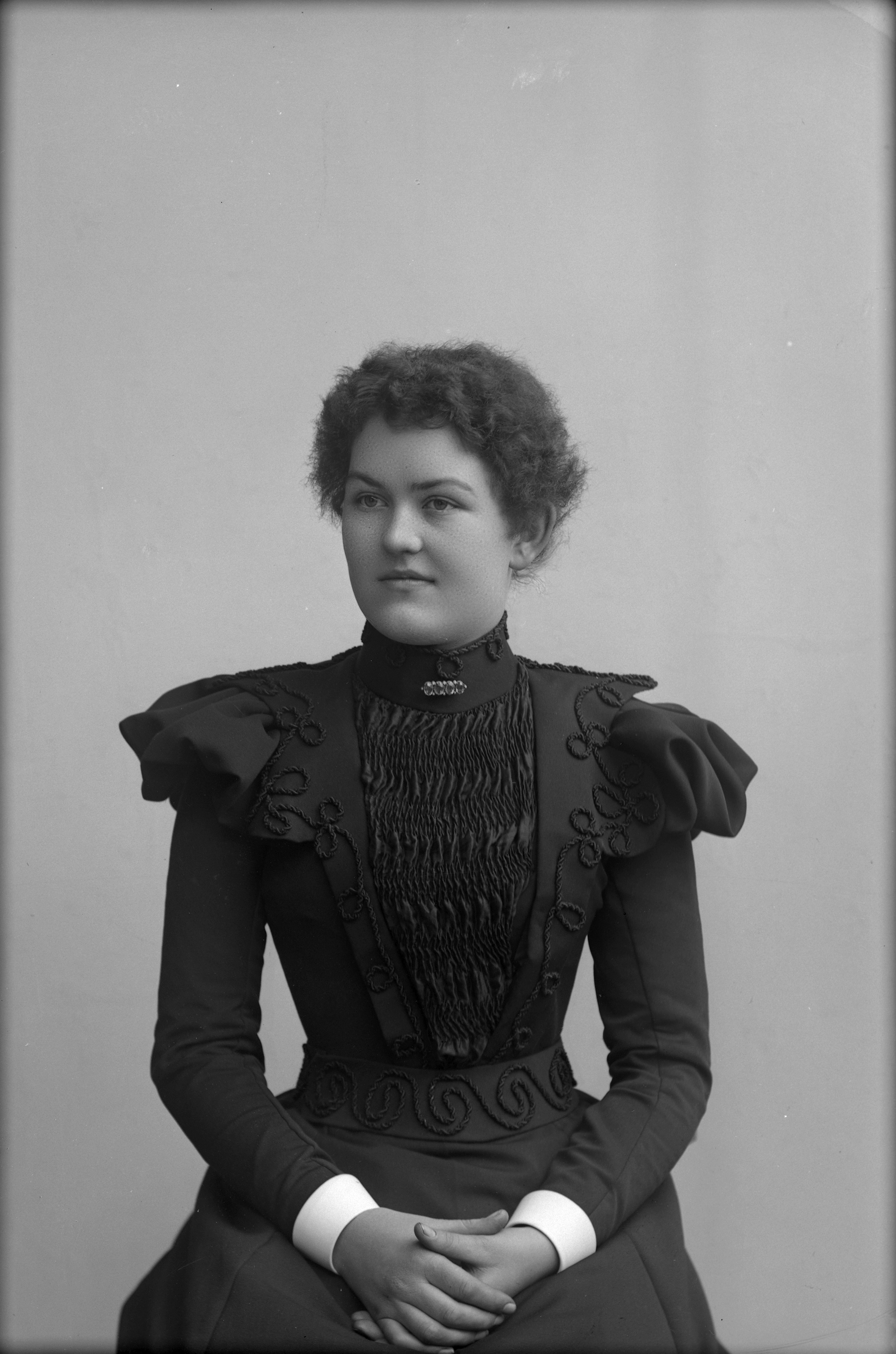 Beskrivning: Porträtt i halvfigur av Sigrid Lovisa Lefévre vid Baudes Café.