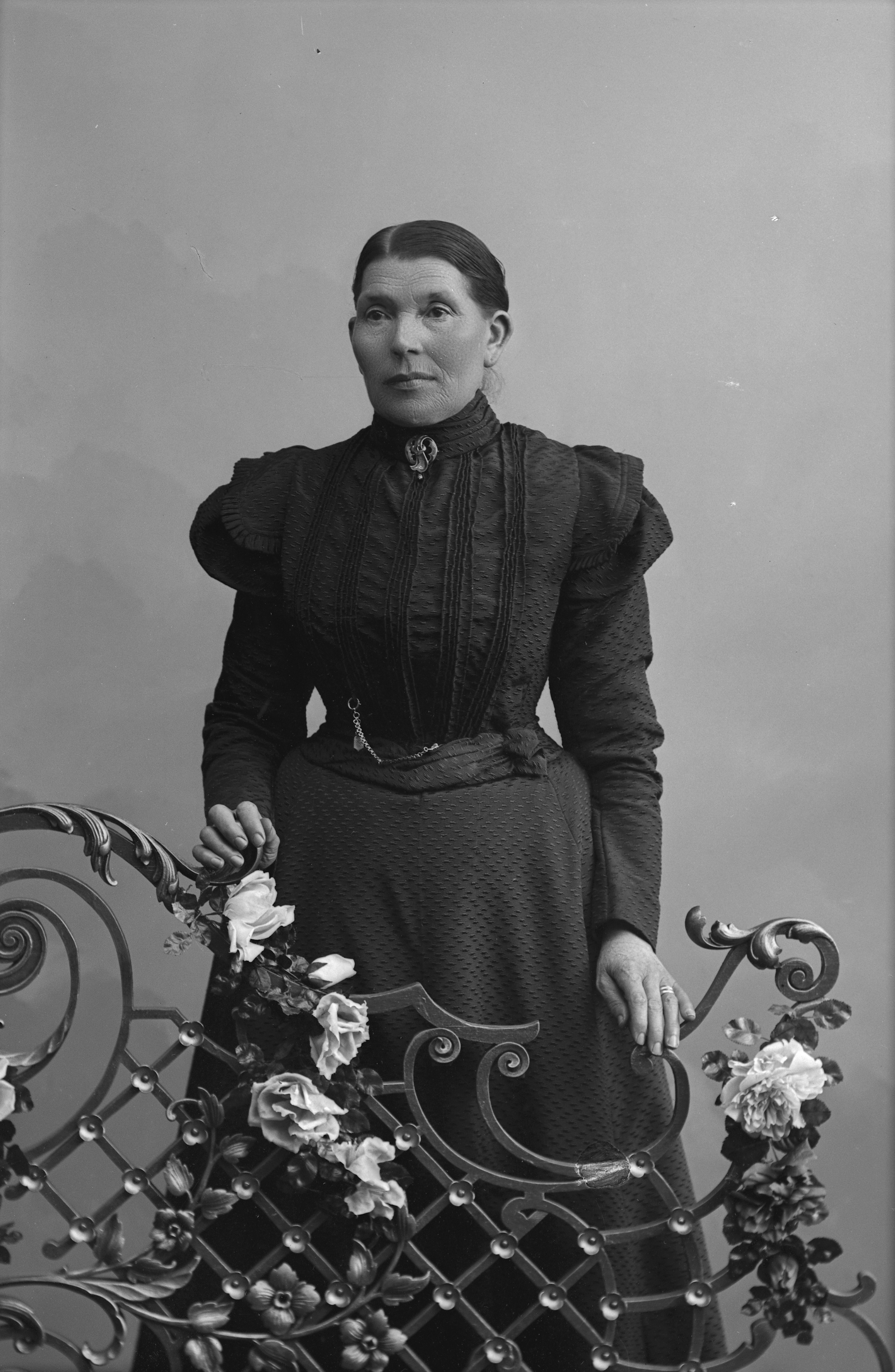 Porträtt i helfigur av fru Weinberg, stående vid spaljé med blomster.