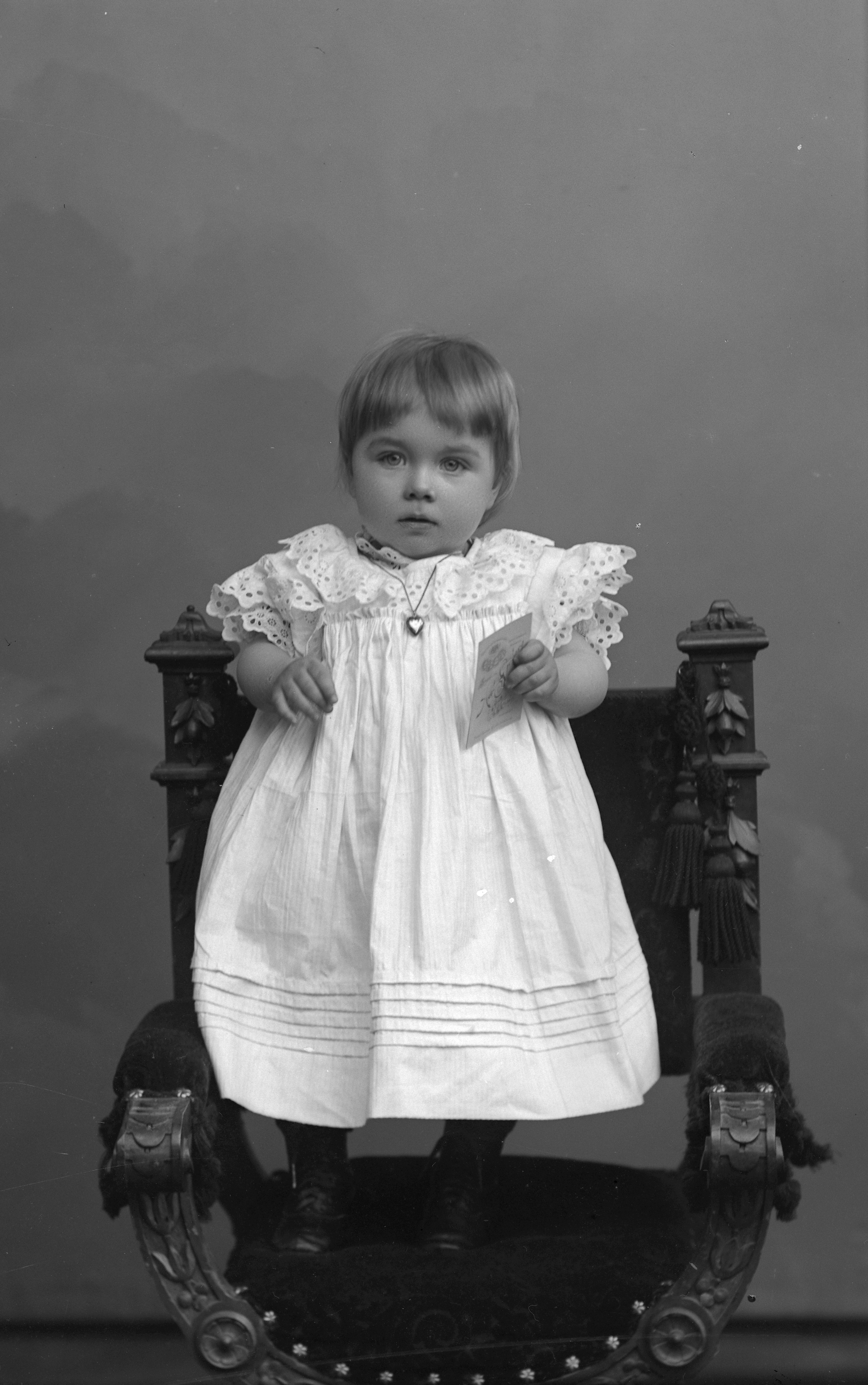 Porträtt i helfigur av Julia Burman, stående på stol.
